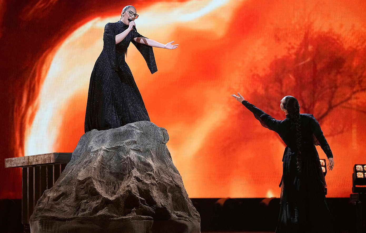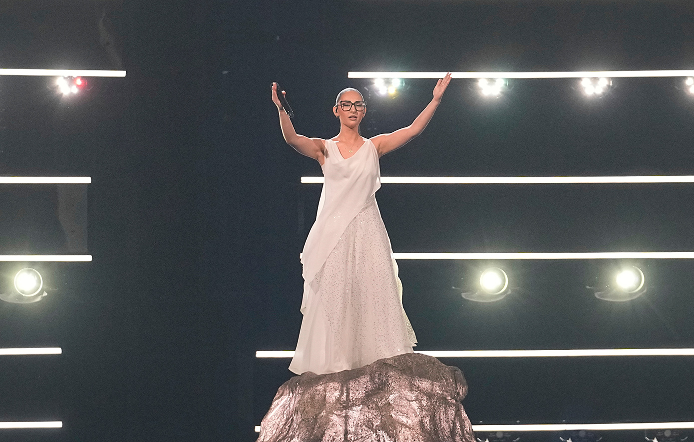 Καθώς το τραγούδι προχωρούσε, η Klavdia περπάτησε αργά προς έναν βράχο στο κέντρο της σκηνής, έχοντας πίσω της μια μοναδική χορεύτρια. Η χορογραφία μεταξύ τους ήταν γεμάτη συγκίνηση, μεταφέροντας τη σιωπηλή, βαθιά σχέση ανάμεσα σε δύο υπάρξεις — σαν μάνα και κόρη, σαν παρελθόν και παρόν.