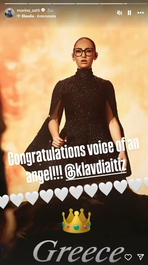 Mε ένα story στον λογαριασμό της στο Instagram, η περσινή εκπρόσωπος Μαρίνα Σάττι συνεχάρη τη φετινή, Κλαυδία, για την -εξίσου- επιτυχημένη πορεία της στον Μεγάλο Τελικό της Eurovision 2025, που διοργανώθηκε στη Βασιλεία της Ελβετίας.