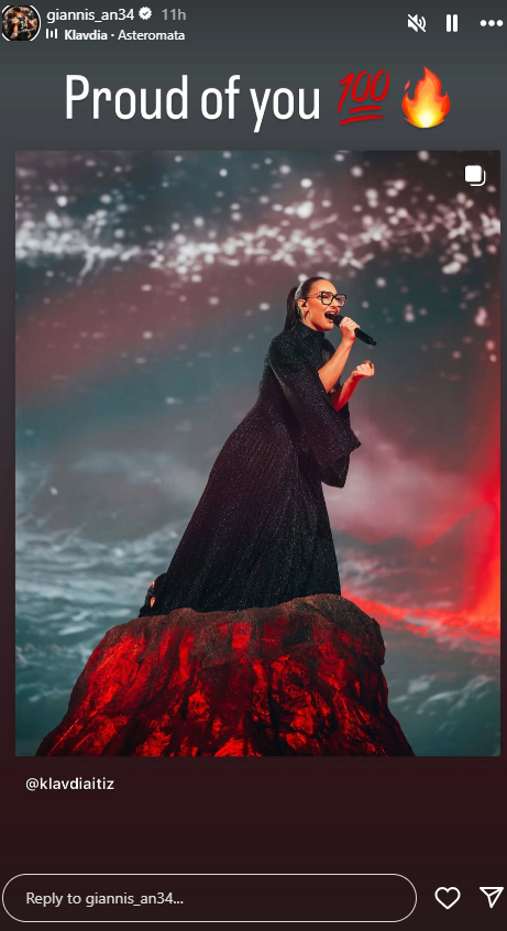 Μια τρυφερή ανάρτηση αφιέρωσε ο Γιάννης Αντετοκούνμπο στην Klavdia, μετά την ολοκλήρωση της συμμετοχής της στη Eurovision 2025. Ο διεθνής σταρ του NBA δημοσίευσε στον προσωπικό του λογαριασμό στο Instagram μια φωτογραφία της τραγουδίστριας, γράφοντας απλά αλλά ουσιαστικά: «Περήφανος για σένα».