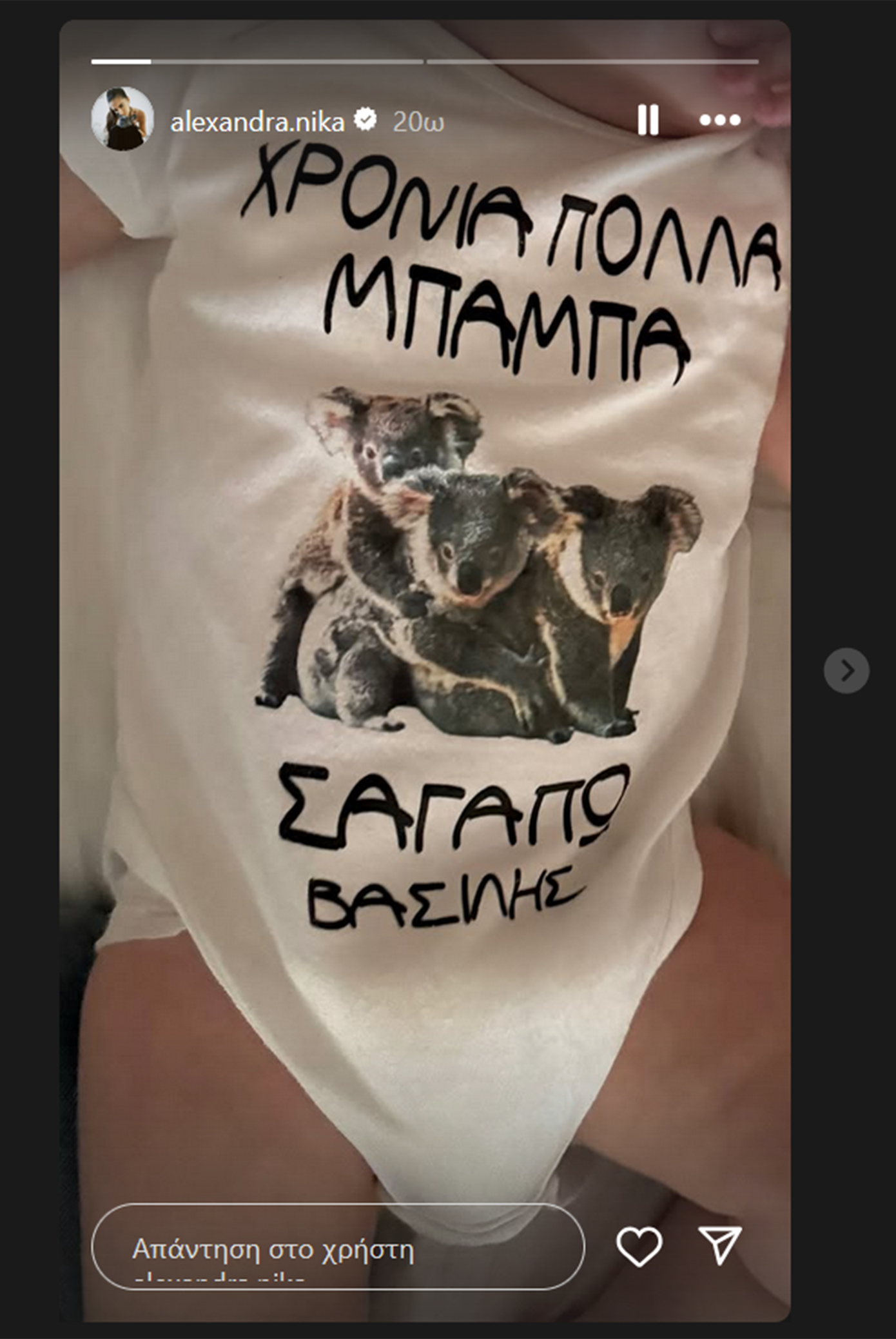 Με αφορμή την ονομαστική εορτή του Κωνσταντίνου Αργυρού, η Αλεξάνδρα Νίκα δημοσίευσε μια φωτογραφία του γιου της, στην οποία τον βλέπουμε να φορά ένα κορμάκι με το μήνυμα: «Χρόνια πολλά μπαμπά. Σ’ αγαπώ. Βασίλης».