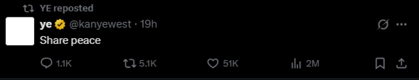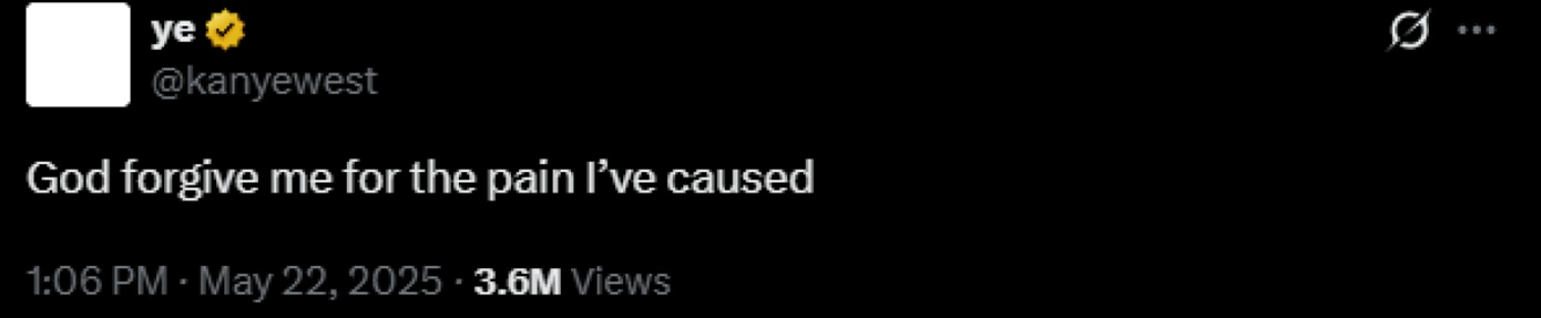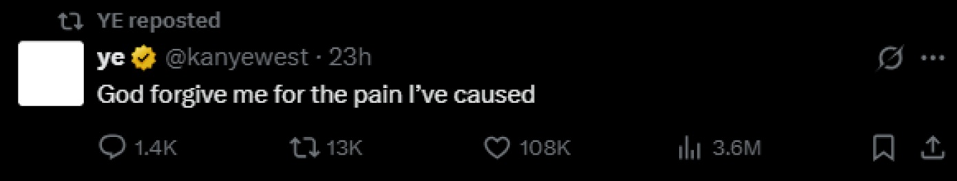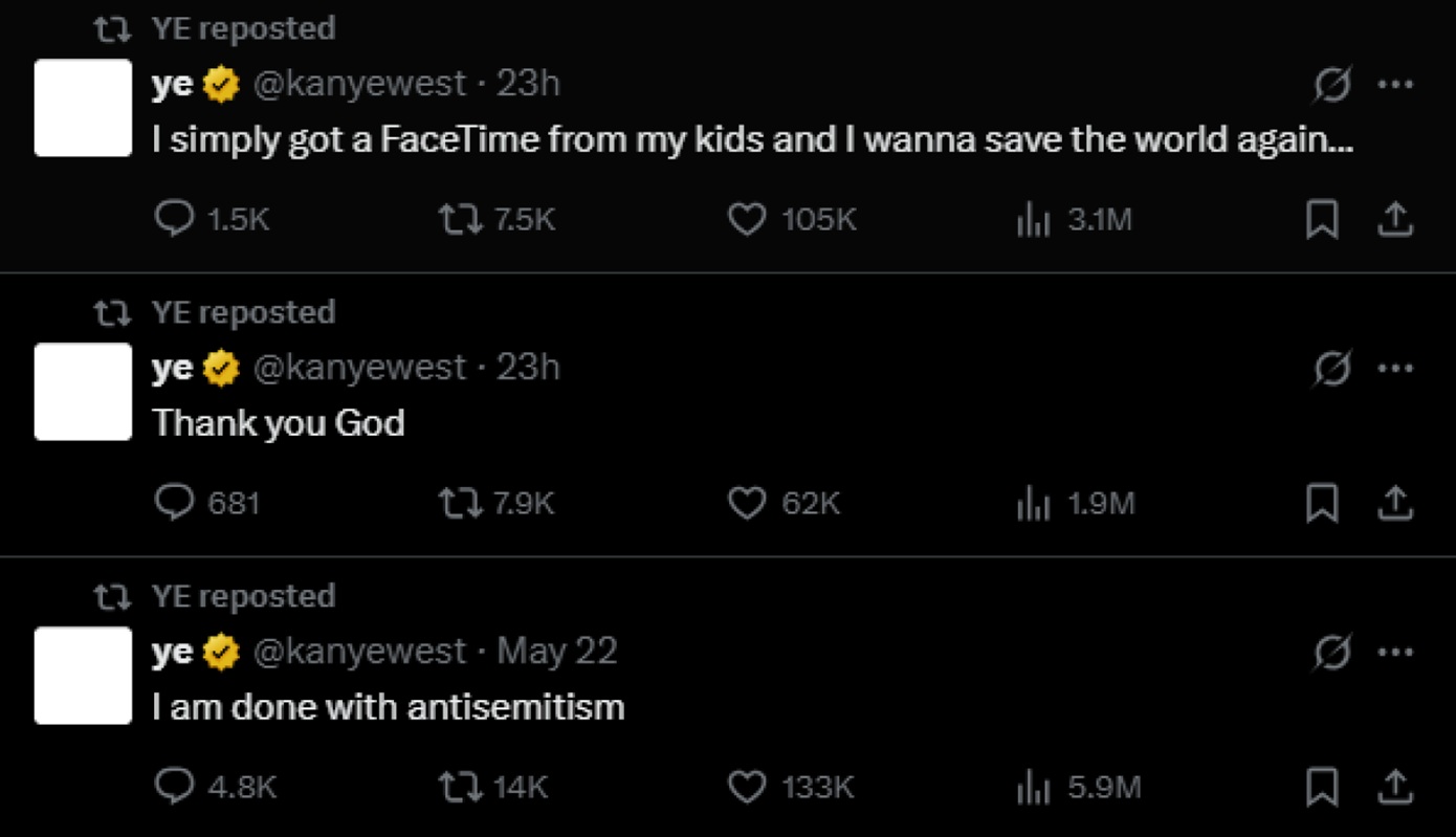 Ο Ye, όπως έχει επιλέξει να αποκαλείται πλέον, έκανε μια σειρά αναρτήσεων στο Twitter, στις οποίες αναφέρει πως «αγαπά όλους τους ανθρώπους» και ότι έχει «τελειώσει με τον αντισημιτισμό». Πρόκειται για μια δήλωση που έρχεται σε πλήρη αντίθεση με τα προηγούμενα ξεσπάσματά του, όπως το προκλητικό τραγούδι «Heil Hitler» και άλλες ακραίες τοποθετήσεις.