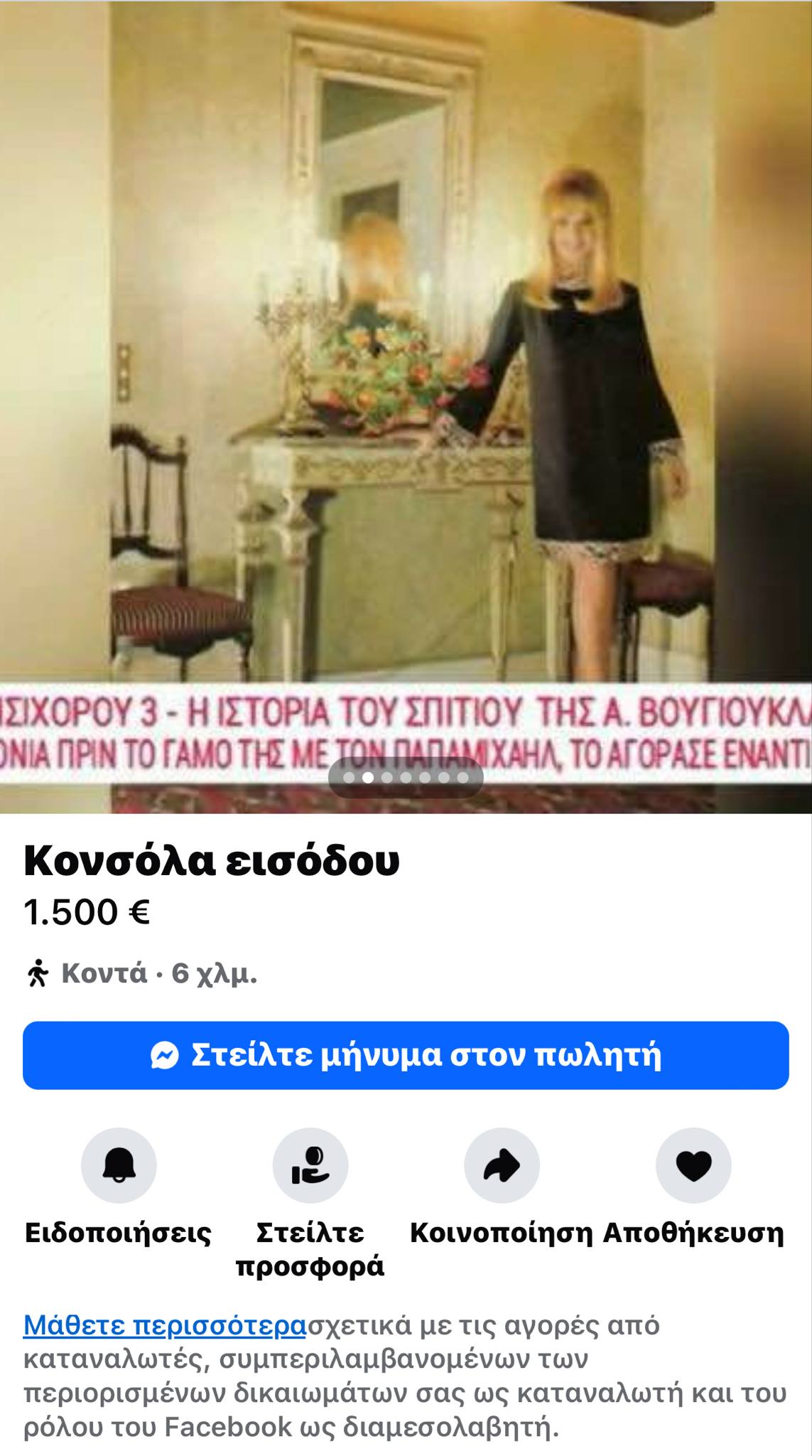 Το έπιπλο πωλείται έναντι του ποσού των 1.500 ευρώ και μεταξύ άλλων στην αγγελία που το συνοδεύει αναφέρονται τα εξής: «κονσόλα εισόδου σε άριστη κατάσταση τα ξύλα της και ο καθρέπτης της, έχει σπασμένο μάρμαρο όπως φαίνεται και στις φωτογραφίες η κονσόλα αυτή ήταν στο σπίτι της Αλίκης Βουγιουκλάκη στη Στησιχόρου όπως δείχνουν και οι φωτογραφίες, ένα σπάνιο έπιπλο».