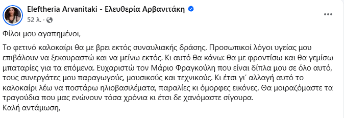 Η Ελευθερία Αρβανιτάκη ανακοίνωσε μέσω ανάρτησης στα μέσα κοινωνικής δικτύωσης την απόφασή της να απέχει από τις καλοκαιρινές συναυλίες, επικαλούμενη προσωπικούς λόγους υγείας. Η κορυφαία Ελληνίδα ερμηνεύτρια τόνισε την ανάγκη για ξεκούραση ως προτεραιότητα, χωρίς ωστόσο να αποκαλύψει λεπτομέρειες σχετικά με το πρόβλημα υγείας που αντιμετωπίζει. Παράλληλα, εξέφρασε τις ευχαριστίες της στον Μάριο Φραγκούλη, με τον οποίο επρόκειτο να συνεργαστεί σε περιοδεία, καθώς και σε όλους τους συνεργάτες της για την πολύτιμη στήριξή τους.