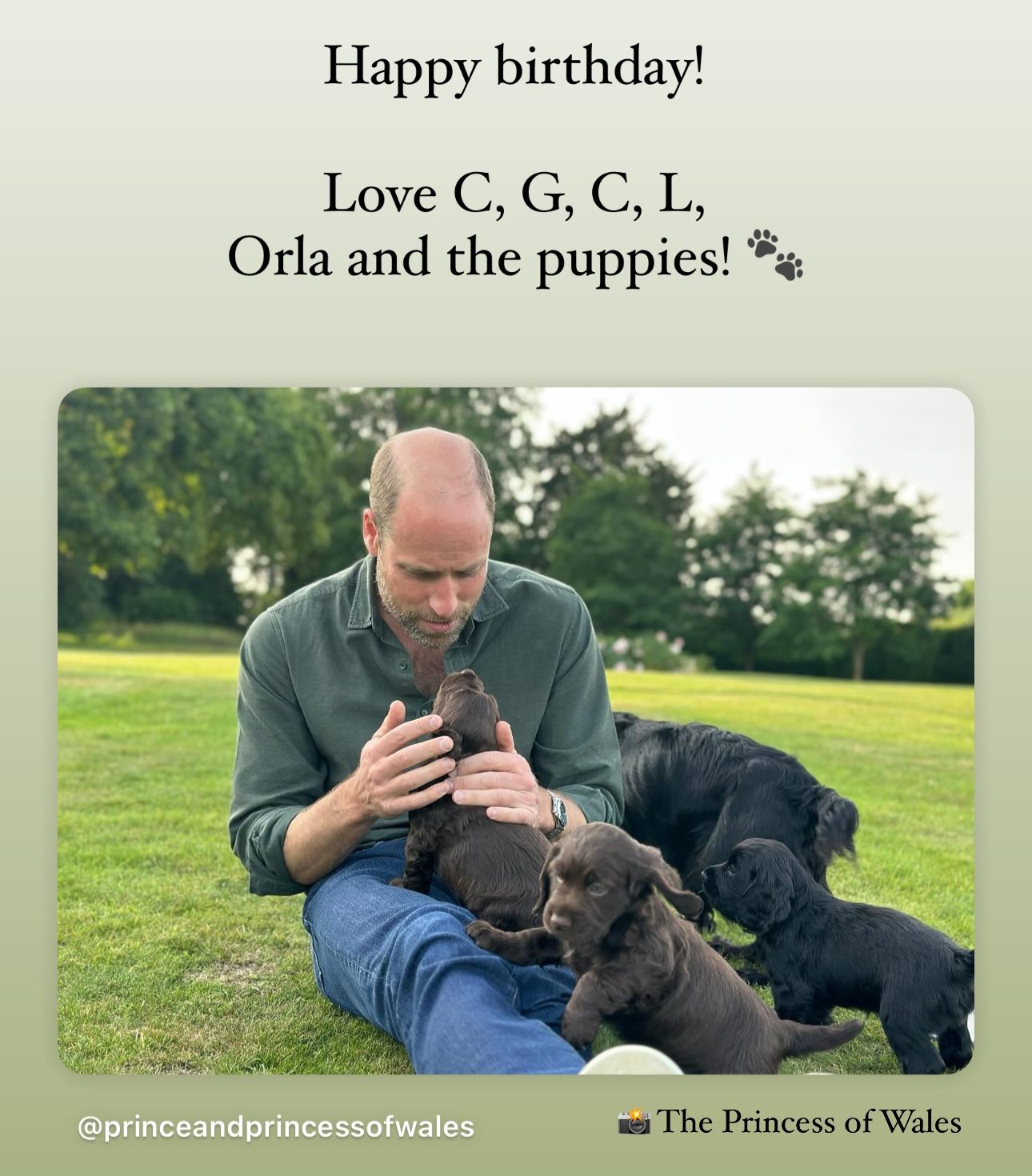 Η λεζάντα, υπογεγραμμένη από την Κέιτ και τα παιδιά τους (Τζορτζ, Σάρλοτ, Λούις), καθώς και την Όρλα, έγραφε: «Χαρούμενα γενέθλια! Με αγάπη Κ, Γ, Κ, Λ, Όρλα και τα κουτάβια!».