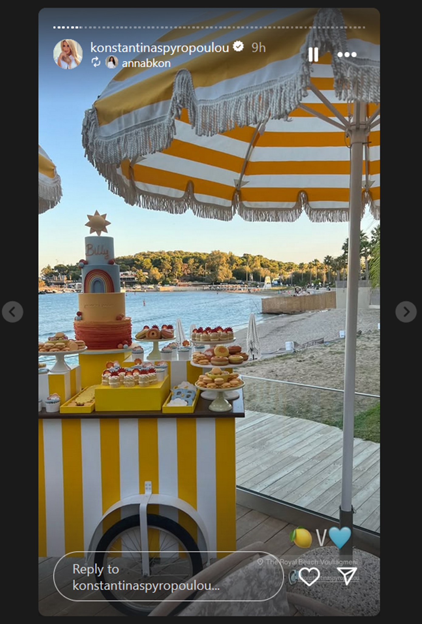 Ο νεοφώτιστος πήρε το όνομα Βασίλης και οι φωτογραφίες από τη λαμπερή βάπτιση δημοσιεύτηκαν από την Κωνσταντίνα Σπυροπούλου στο Instagram. Μετά την τελετή, ακολούθησε εντυπωσιακή δεξίωση στo «Royal Beach» της Βουλιαγμένης, με πολύχρωμη διακόσμηση από άνθη, εντυπωσιακή τούρτα με το όνομα του μικρού στα αγγλικά και λαχταριστά γλυκίσματα.