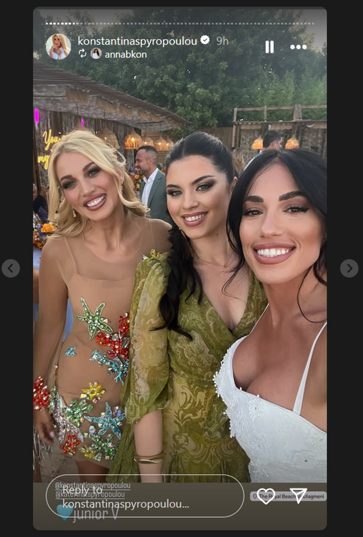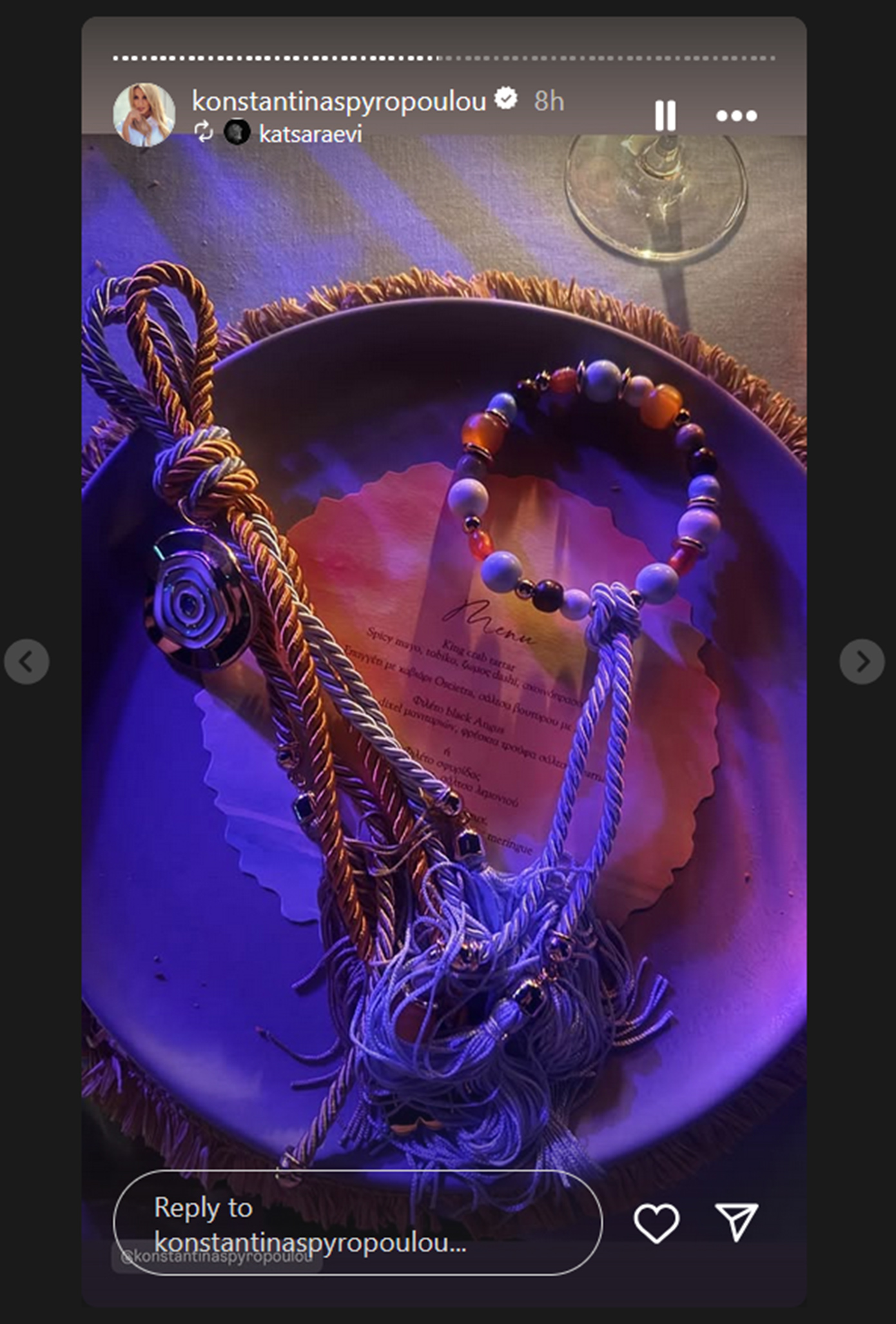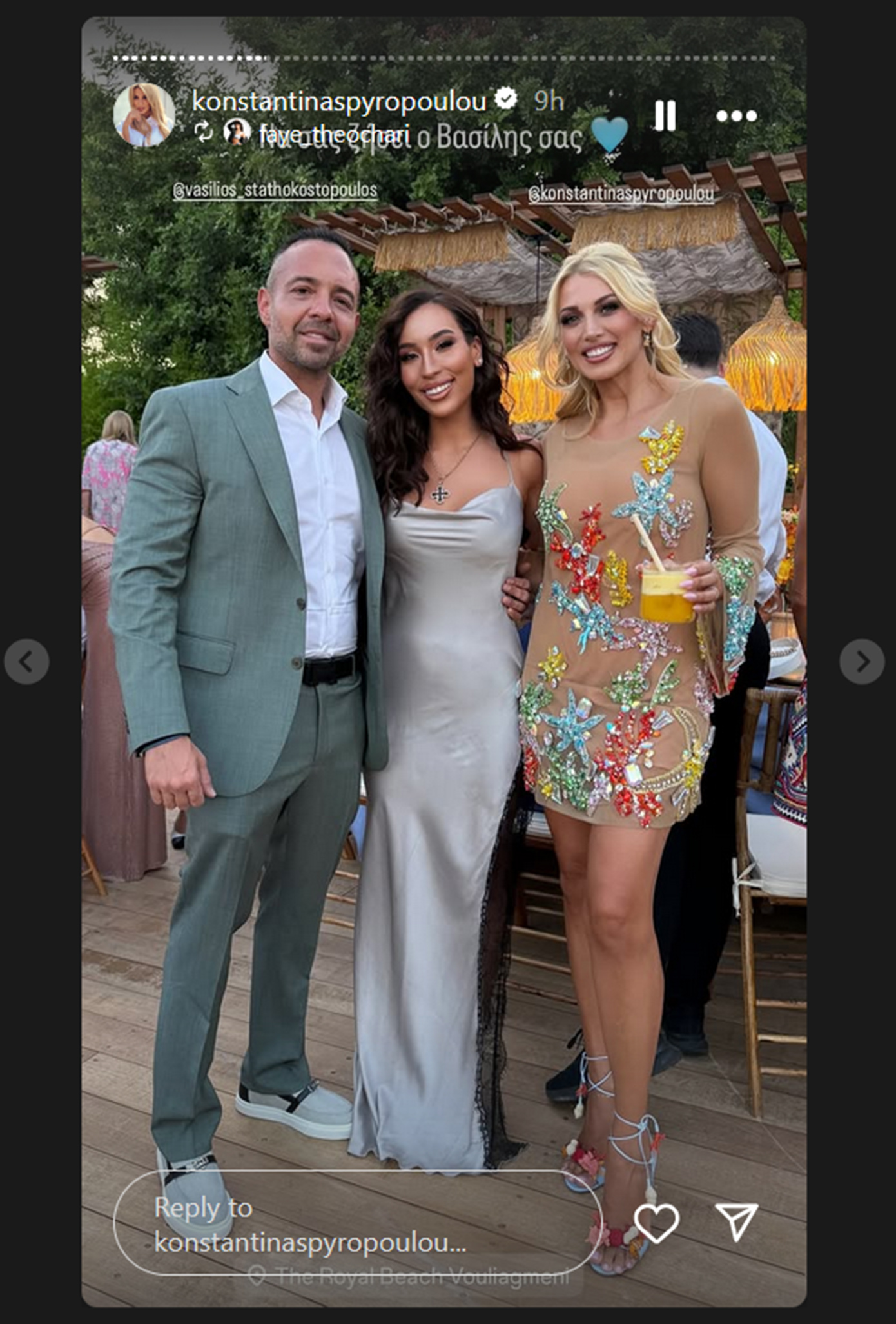 Η Κωνσταντίνα Σπυροπούλου εμφανίστηκε με δύο κομψά φορέματα, τα οποία ήταν σχεδιασμένα από τη Σήλια Κριθαριώτη.