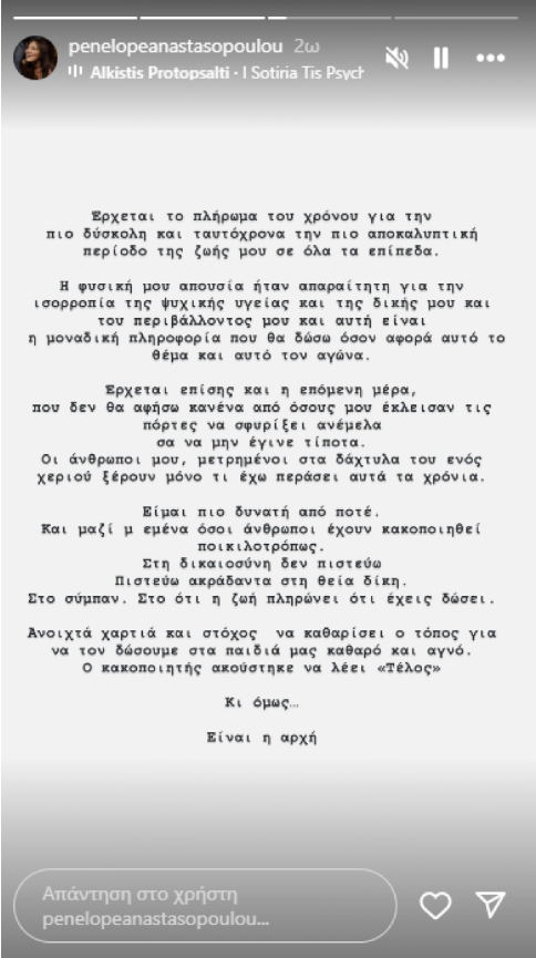 Σε αντίθεση με άλλες καταγγέλλουσες, η Πηνελόπη Αναστασοπούλου επέλεξε να μην παραστεί στο Εφετείο τις προηγούμενες εβδομάδες. Μέσω της ανάρτησής της, εξήγησε την απόφασή της αυτή, τονίζοντας πως προτεραιότητά της ήταν η διαφύλαξη της ψυχικής της υγείας, τόσο της δικής της όσο και του άμεσου περιβάλλοντός της.
