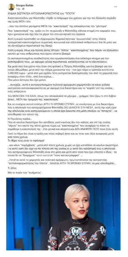 Στην ανάρτησή του, ο Γιώργος Καρκάς προχώρησε σε περαιτέρω κατηγορίες, αναφέροντας πως η Πηνελόπη Αναστασοπούλου είχε χαρακτηρίσει στο παρελθόν τον Πέτρο Φιλιππίδη ως «μέντορά της». Έκανε λόγο για μια «χυδαία εκστρατεία αυτοαναφορικότητας του τίποτα», υπονοώντας ότι οι κινήσεις της ηθοποιού είναι υποκινούμενες από την επιθυμία για δημοσιότητα.