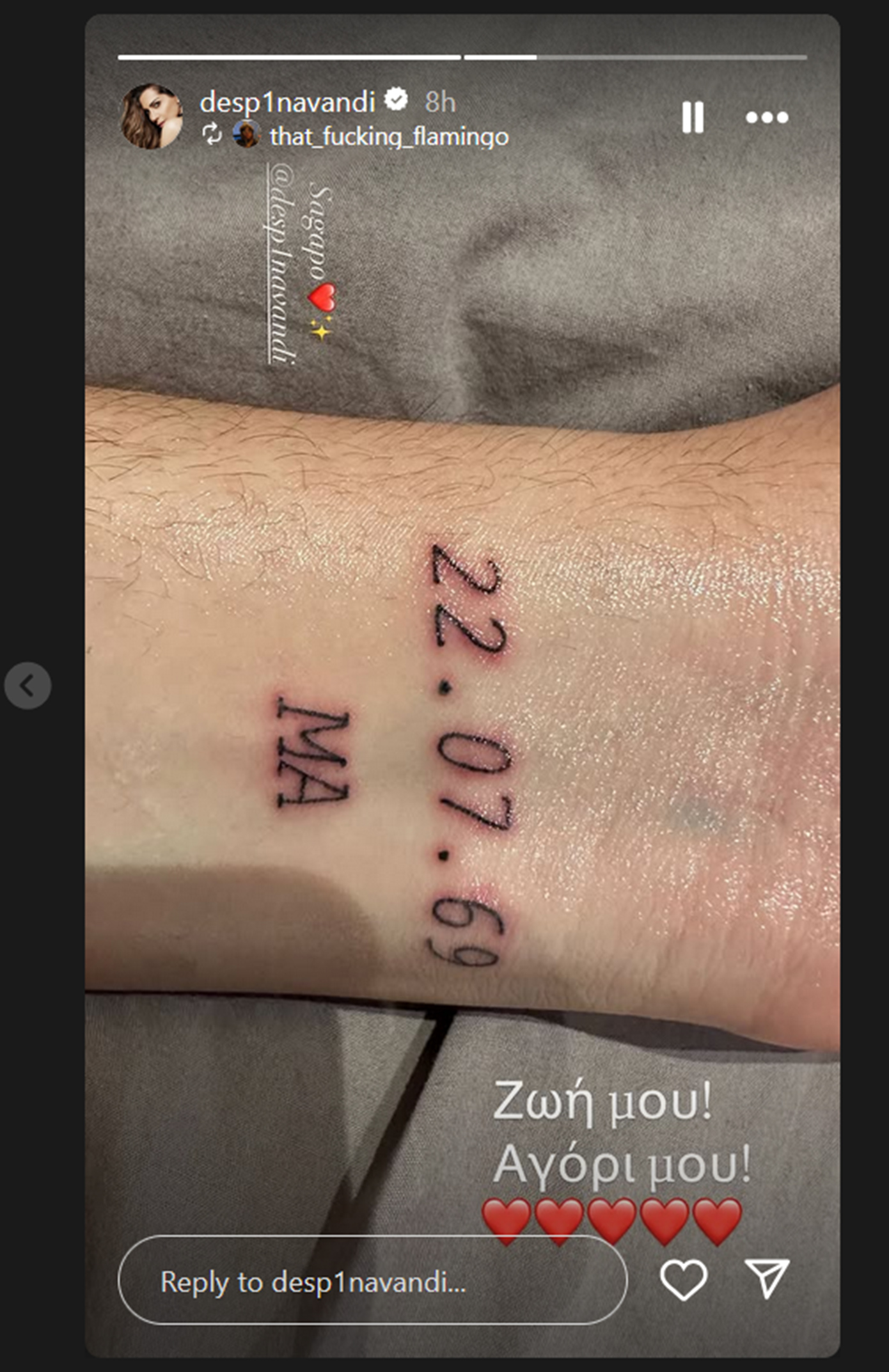 Ο Γιώργος Νικολαΐδης, όπως θα δείτε στην παρακάτω φωτογραφία που δημοσίευσε η Δέσποινα Βανδή στα Instagram Stories, έκανε τατουάζ την ημερομηνία γέννησης της Δέσποινας Βανδή γράφοντας «ΜΑ», εκδηλώνοντας με αυτόν τον τρόπο την αγάπη του στη μητέρα του.