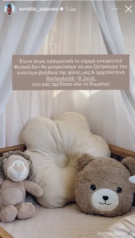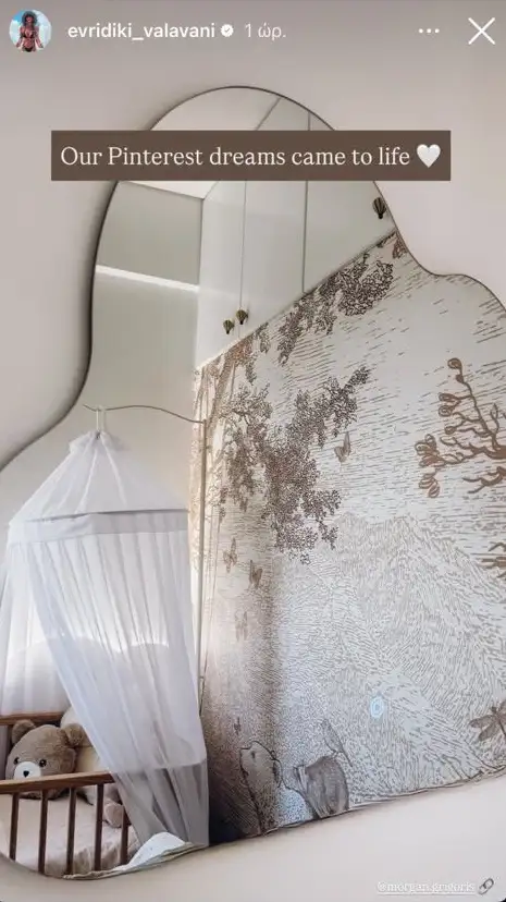 Παράλληλα, όπως φαίνεται και στις εικόνες, η ίδια με τον Γρηγόρη Μόργκαν έχουν φροντίσει να ετοιμάσουν με κάθε λεπτομέρεια το βρεφικό δωμάτιο, το οποίο κυριαρχείται από αποχρώσεις του καφέ, του εκρού, του μπεζ και του λευκού, δημιουργώντας μια παραμυθένια ατμόσφαιρα.