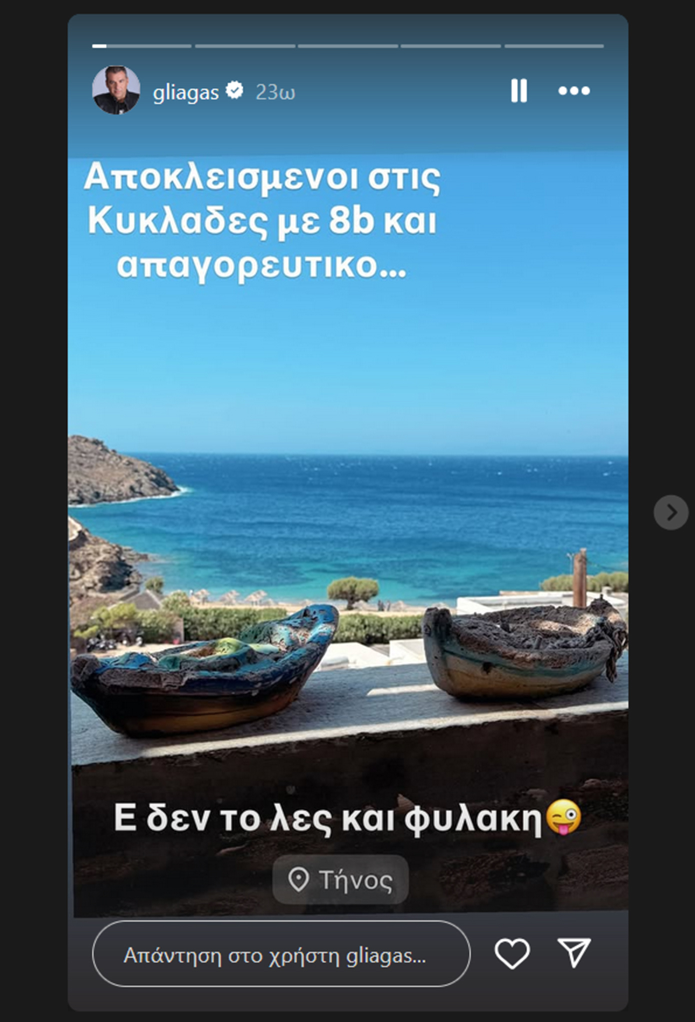 «Αποκλεισμένοι στις Κυκλάδες με 8 μποφόρ και απαγορευτικό. Ε, δεν το λες και φυλακή», σημείωσε ο παρουσιαστής στο Instagram.