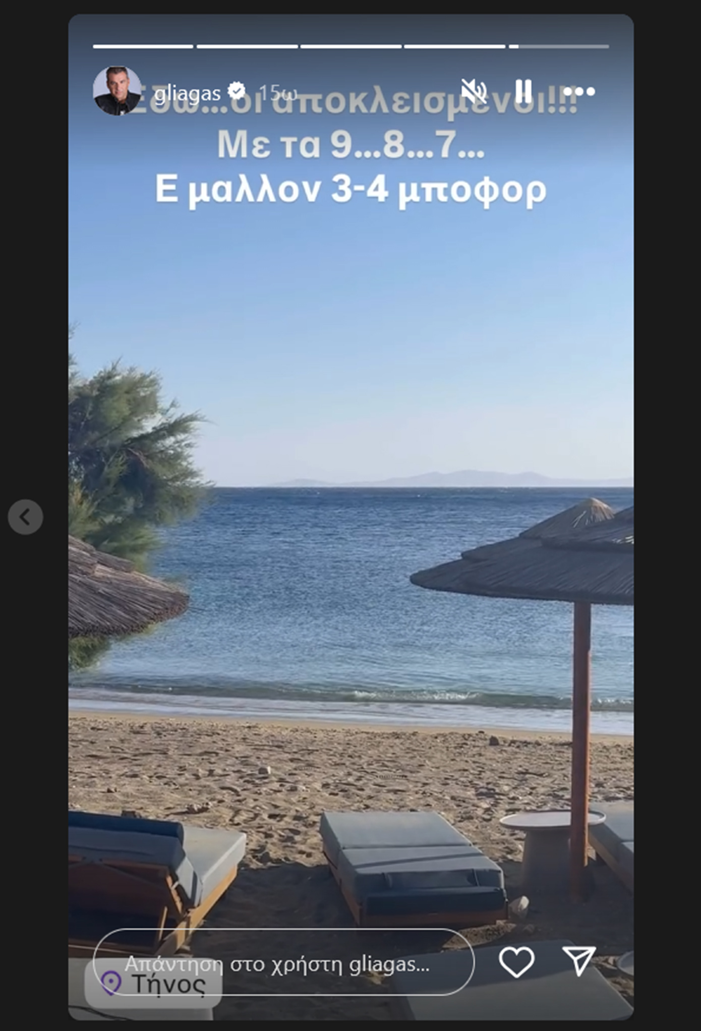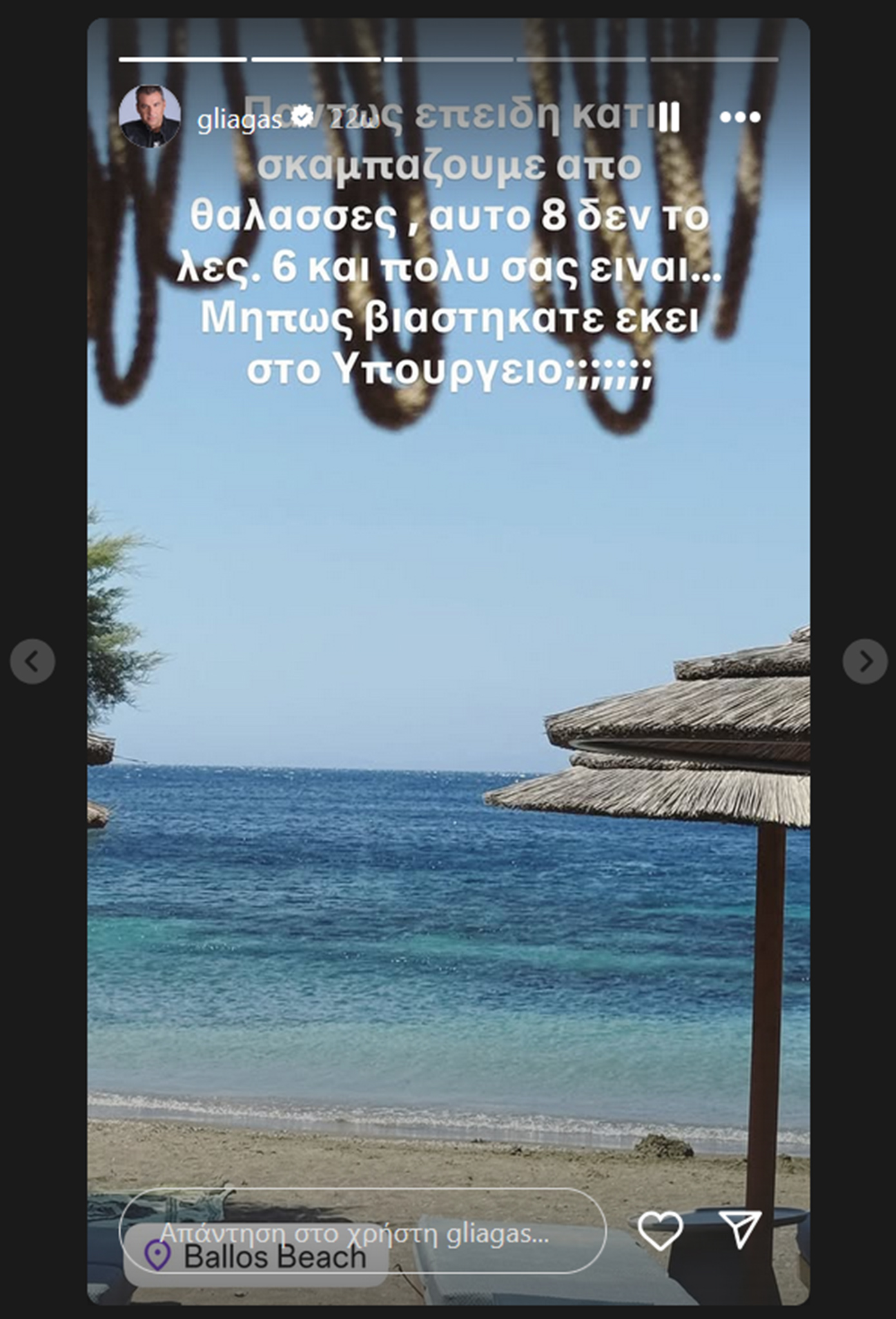 Σε επόμενο story, δεν παρέλειψε να πετάξει και τη σπόντα του προς τους αρμόδιους που αποφάσισαν να βγάλουν απαγορευτικό, λέγοντας: «Πάντως επειδή σκαμπάζουμε κάτι από θάλασσες, αυτό 8 μποφόρ δεν το λες. 6 και πολύ σας είναι. Μήπως βιαστήκατε εκεί στο Υπουργείο;».