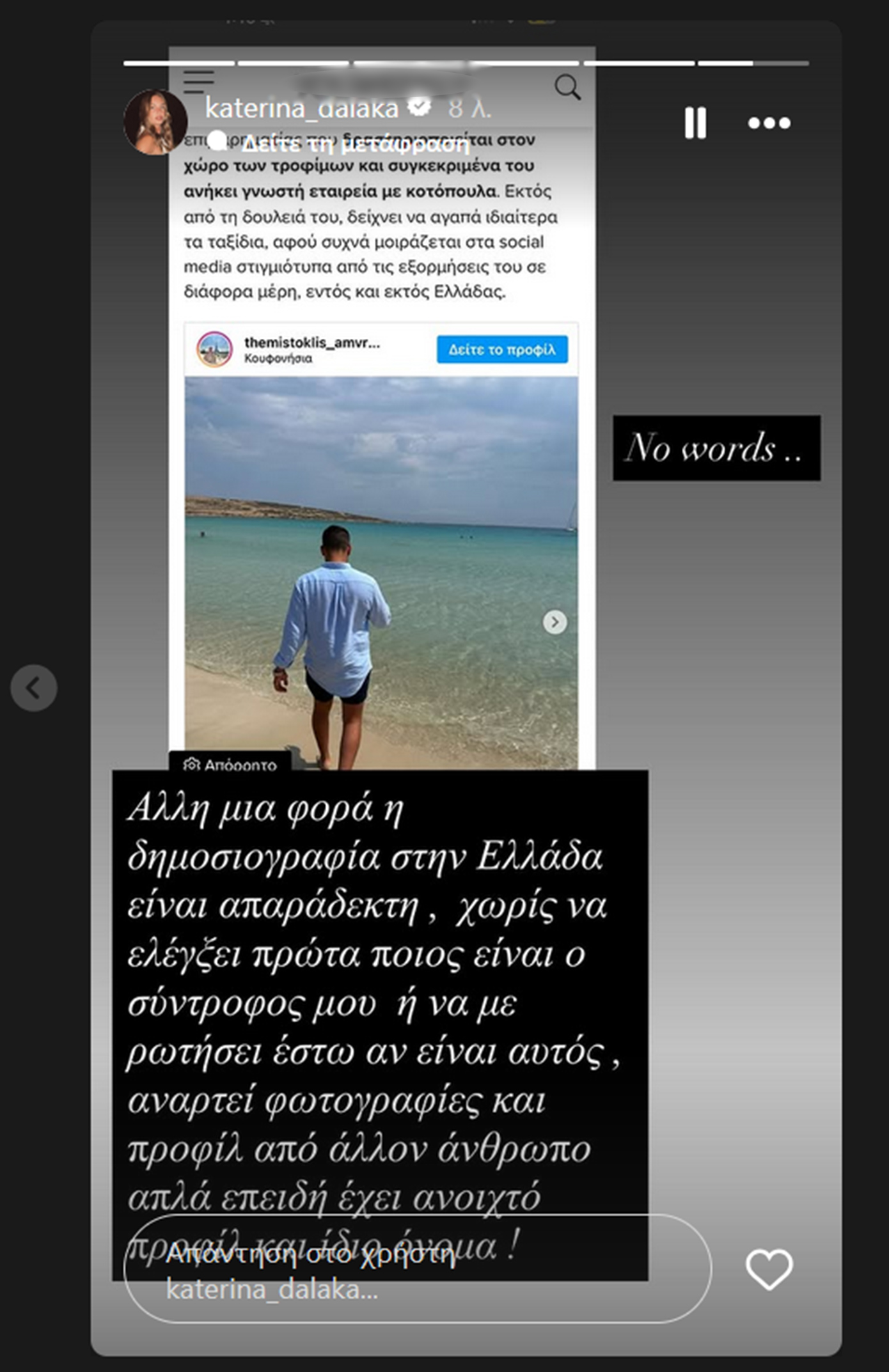 Λίγες ώρες αργότερα, η Κατερίνα Δαλάκα ξέσπασε στο Instagram, σημειώνοντας στα Instagram Stories: «Άλλη μια φορά δημοσιογραφία στην Ελλάδα είναι απαράδεκτη. Χωρίς πρώτα να ελέγξει ποιος είναι ο σύντροφός μου ή να με ρωτήσει έστω αν είναι αυτός, αναρτεί φωτογραφίες και προφίλ από άλλον άνθρωπο, απλά επειδή έχει ανοιχτό προφίλ και ίδιο όνομα».