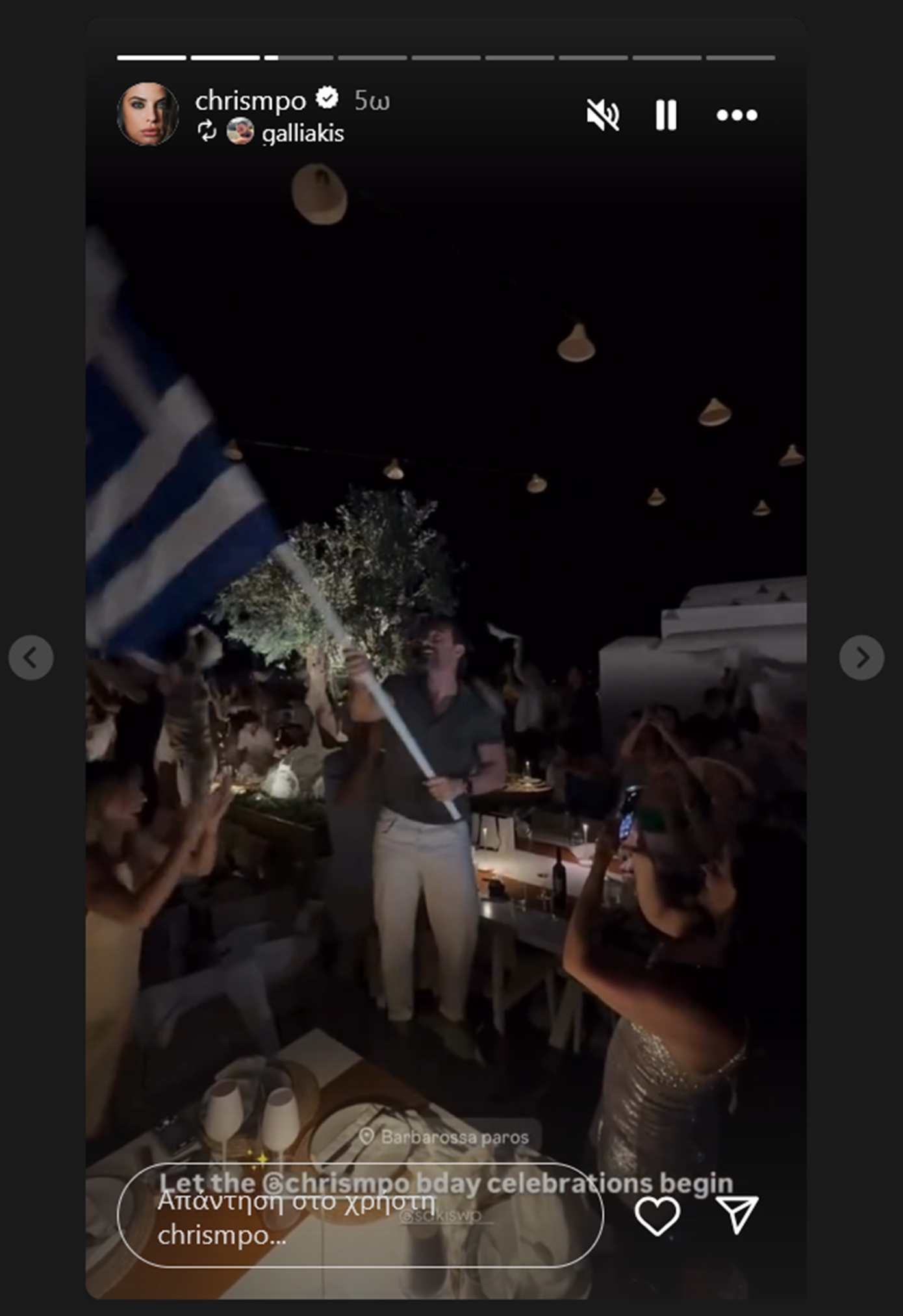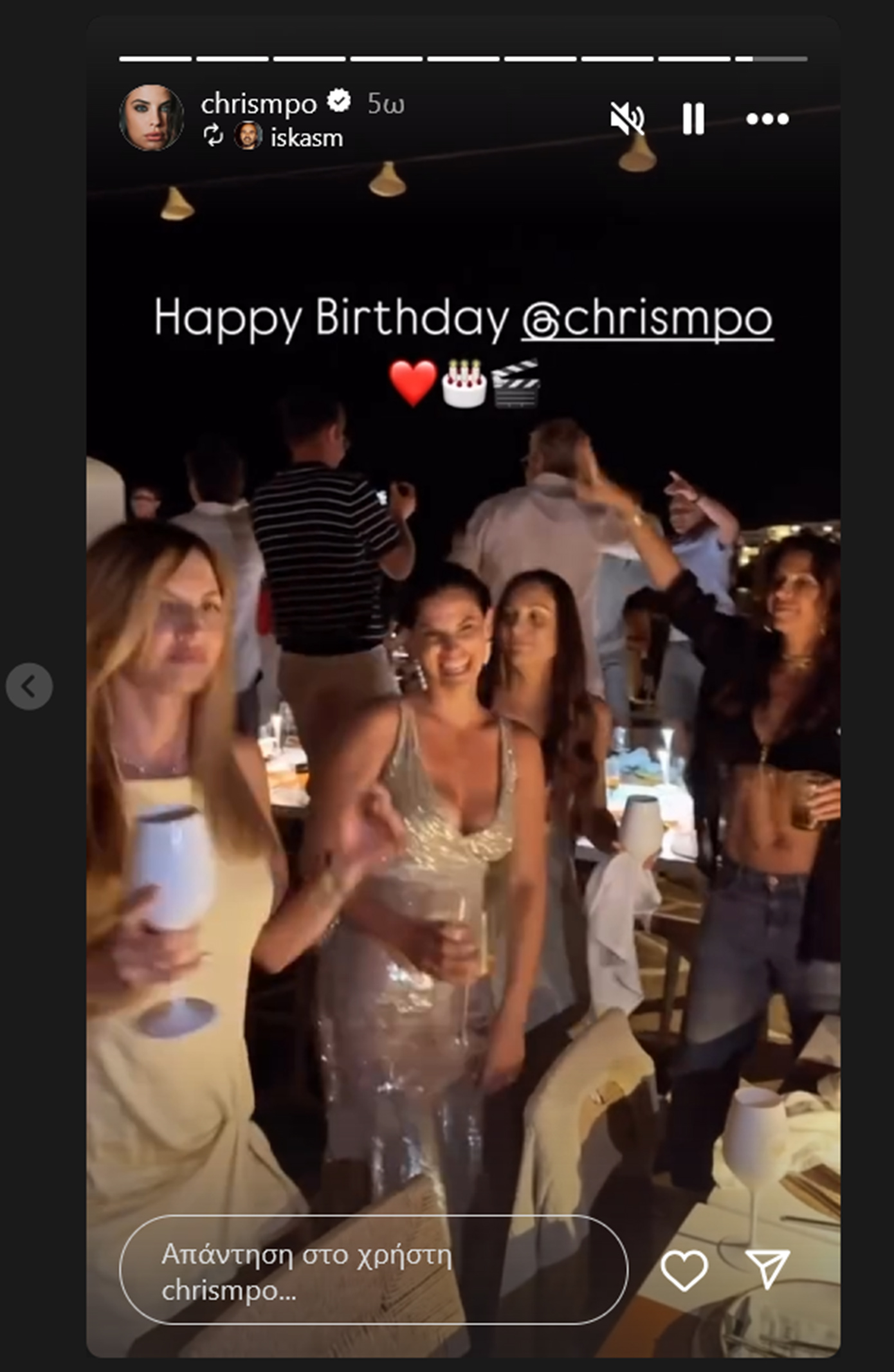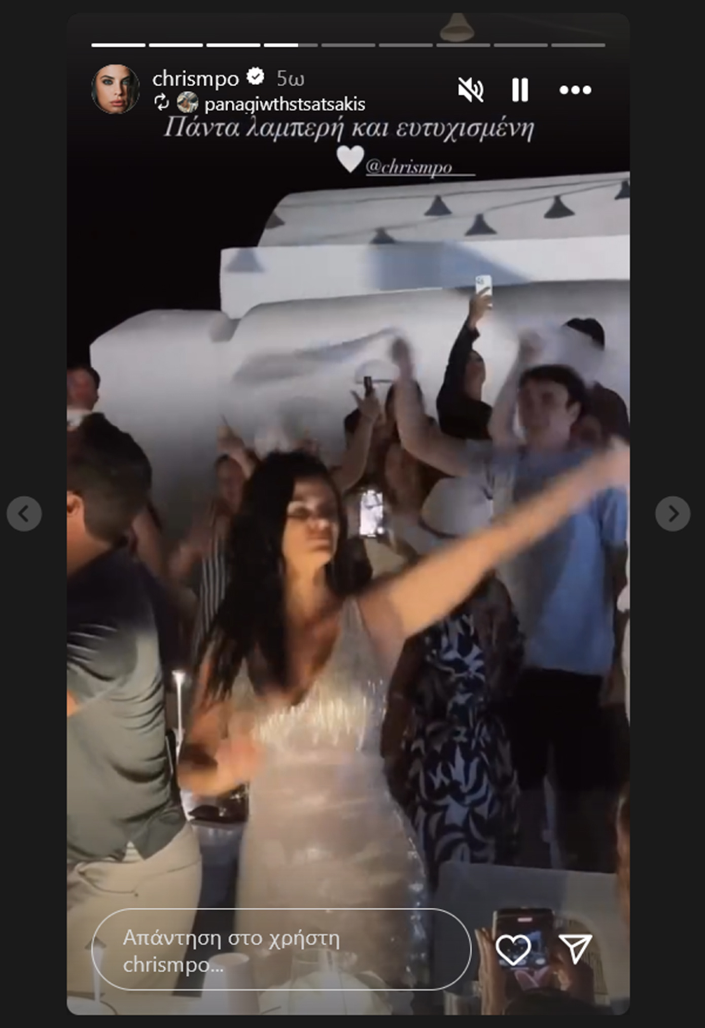Στα βίντεο που μοιράστηκε η ίδια στο Instagram, φαίνεται να ανεβαίνει πάνω στο τραπέζι και να χορεύει στο «Pretty Woman», ενώ ο Σάκης Τανιμανίδης της τραγουδούσε.