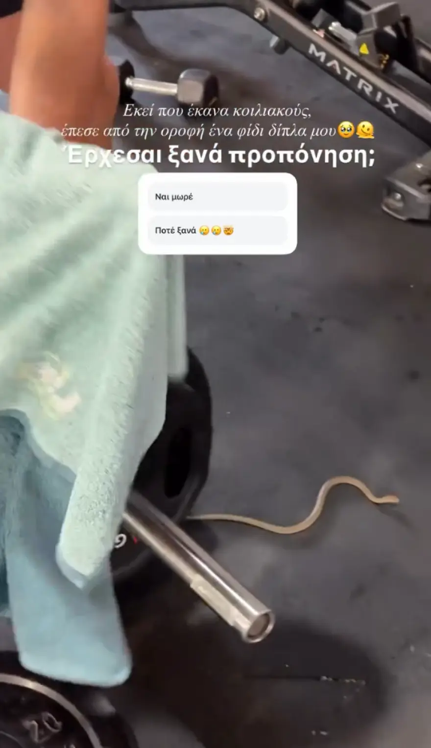 Σχολιάζοντας το περιστατικό, η Ιωάννα Τούνη έγραψε: «Εκεί που έκανα κοιλιακούς, έπεσε από την οροφή ένα φίδι δίπλα μου. Έρχεσαι ξανά προπόνηση;»
