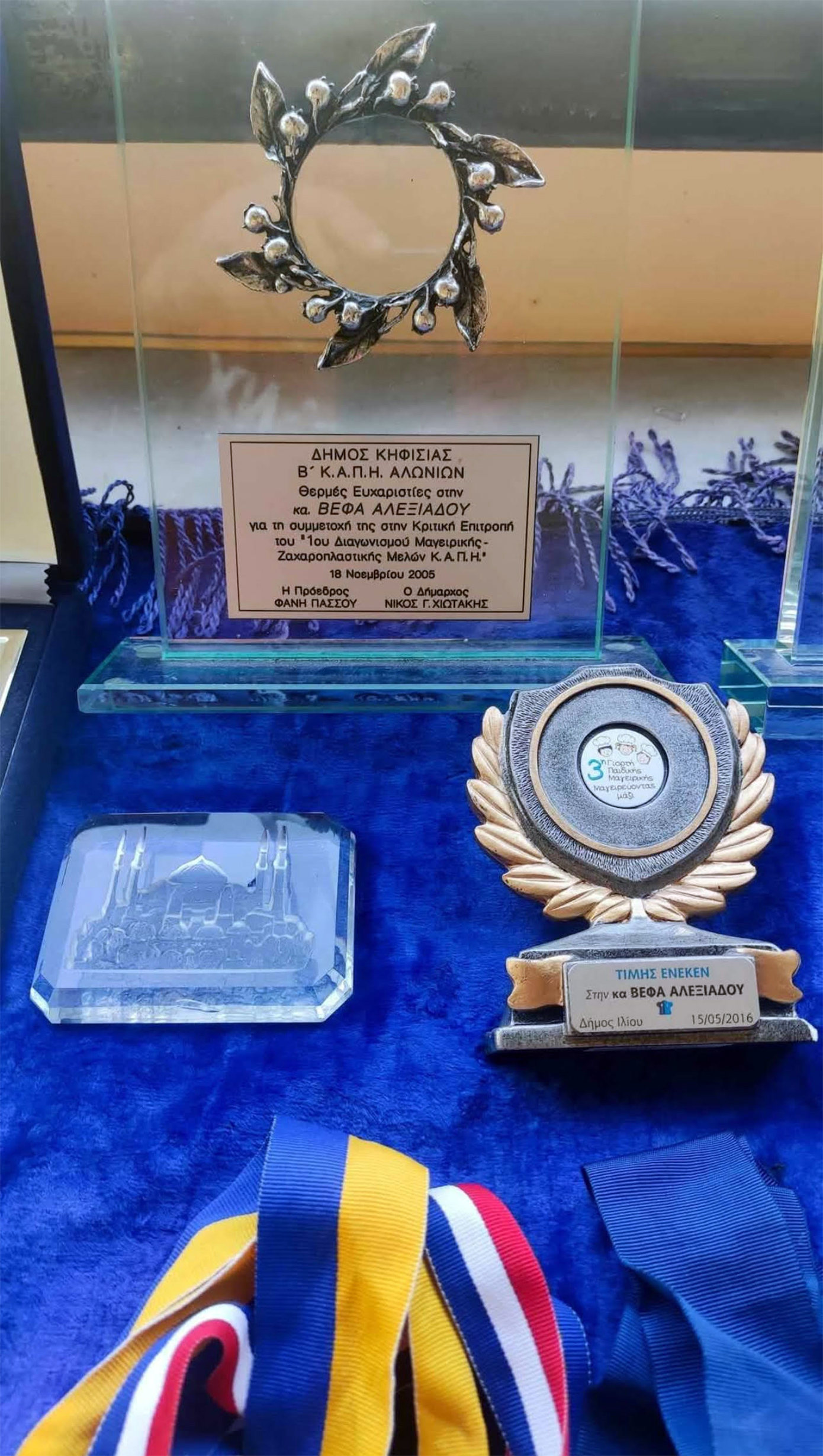 «Καμία απολύτως σχέση δεν είχα με τη Βέφα Αλεξιάδου. Πριν αρκετούς μήνες επισκέφθηκα το παζάρι που γίνεται κάθε Σαββατοκύριακο στον Ελαιώνα για να χαζέψω. Ένας πωλητής τα είχε όλα απλωμένα κάτω. Όχι μόνο αυτά αλλά και άλμπουμ με φωτογραφίες και χύμα φωτογραφίες σε καλάθια. Στην αρχή είδα τα μετάλλια, αλλά δεν είχα καταλάβει ότι ήταν της Βέφας Αλεξιάδου, βραβεία, μετάλλια πλακέτες. Τον ρώτησα πόσο έκαναν και μου είπε αν θέλω να τα πάρω όλα μαζί. Τότε είδα το όνομα και στενοχωρήθηκα να πω την αλήθεια.