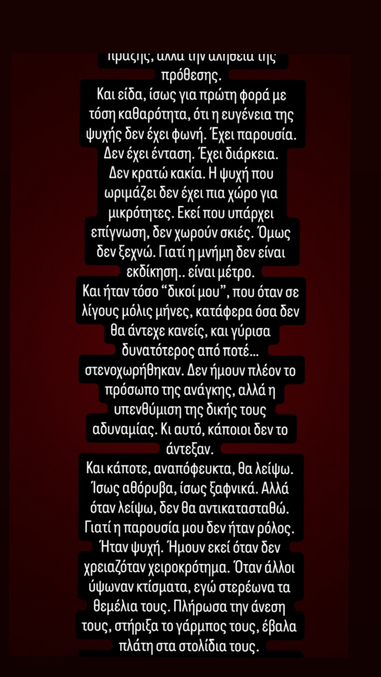 Δεν ήμουν πλέον το πρόσωπο της ανάγκης, αλλά η υπενθύμιση της δικής τους αδυναμίας. Κι αυτό, κάποιοι δεν το άντεξαν. Και κάποτε, αναπόφευκτα, θα λείψω. Ίσως αθόρυβα, ίσως ξαφνικά. Αλλά όταν λείψω, δεν θα αντικατασταθώ. Γιατί η παρουσία μου δεν ήταν ρόλος. Ήταν ψυχή. Ήμουν εκεί όταν δεν χρειαζόταν χειροκρότημα. Όταν άλλοι ύψωναν κτίσματα, εγώ στερέωνα τα θεμέλια τους. Πλήρωσα την άνεση τους, στήριξα το γάρμπος τους, έβαλα πλάτη στα στολίδια τους.