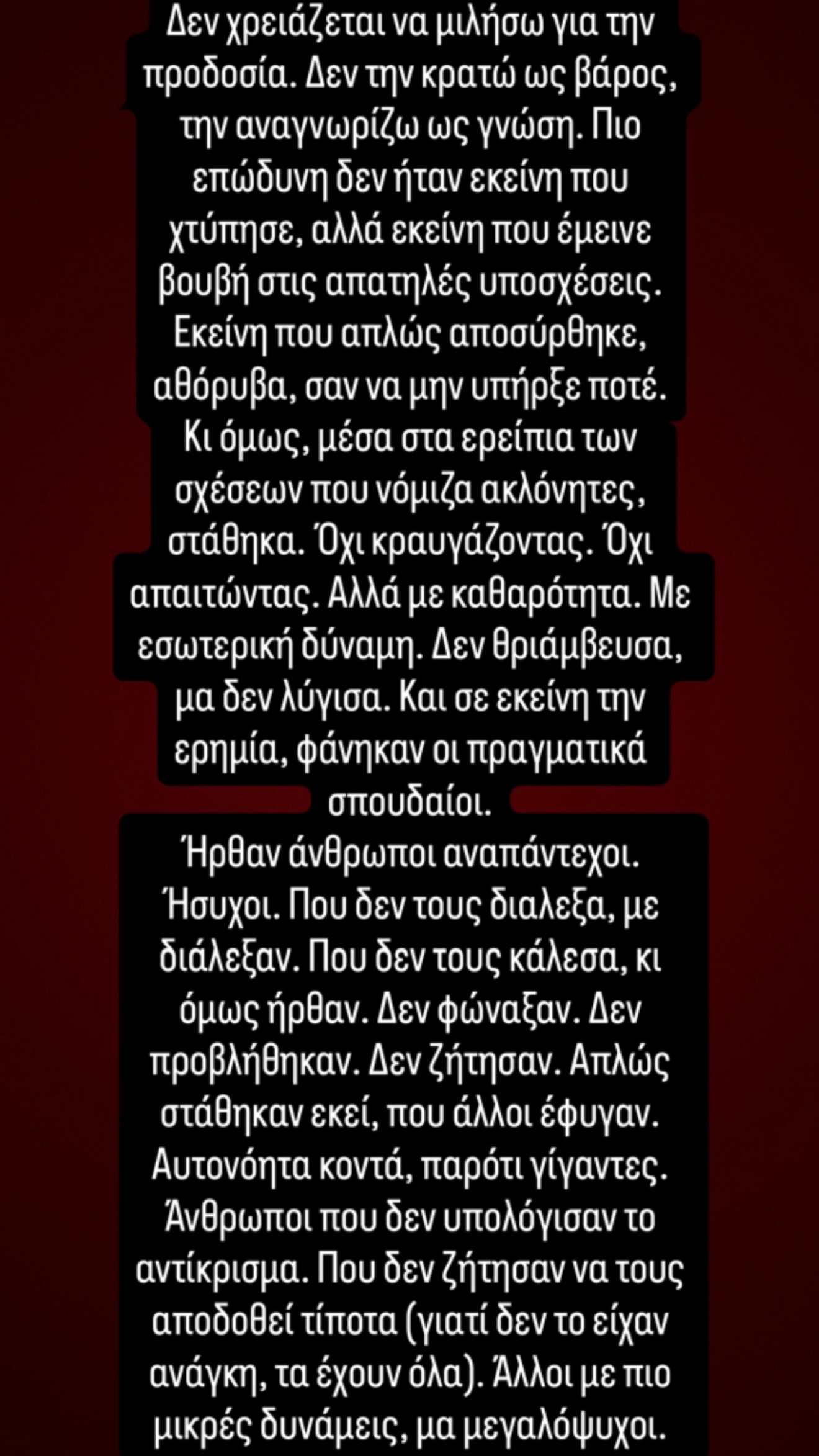 Δεν χρειάζεται να μιλήσω για την προδοσία. Δεν την κρατώ ως βάρος, την αναγνωρίζω ως γνώση. Πιο επώδυνη δεν ήταν εκείνη που χτύπησε, αλλά εκείνη που έμεινε βουβή στις απατηλές υποσχέσεις. Εκείνη που απλώς αποσύρθηκε, αθόρυβα, σαν να μην υπήρξε ποτέ. Κι όμως, μέσα στα ερείπια των σχέσεων που νόμιζα ακλόνητες, στάθηκα. Όχι κραυγάζοντας. Όχι απαιτώντας. Αλλά με καθαρότητα. Με εσωτερική δύναμη. Δεν θριάμβευσα, μα δεν λύγισα. Και σε εκείνη την ερημία, φάνηκαν οι πραγματικά σπουδαίοι.