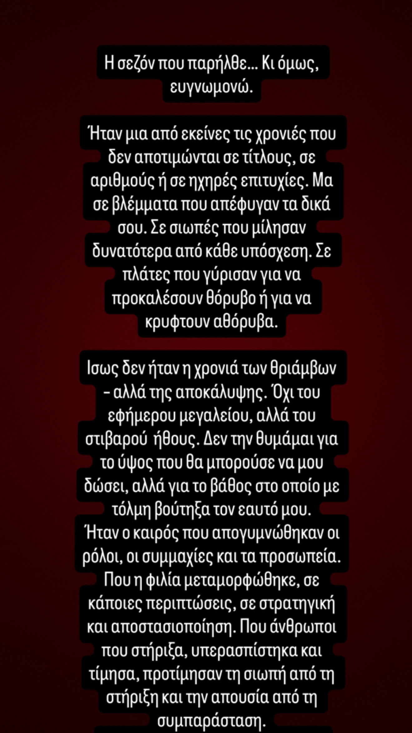 «Η σεζόν που παρήλθε… Κι όμως, ευγνωμονώ. Ήταν μια από εκείνες τις χρονιές που δεν αποτιμώνται σε τίτλους, σε αριθμούς ή σε ηχηρές επιτυχίες. Μα σε βλέμματα που απέφυγαν τα δικά σου. Σε σιωπές που μίλησαν δυνατότερα από κάθε υπόσχεση. Σε πλάτες που γύρισαν για να προκαλέσουν θόρυβο ή για να κρυφτούν αθόρυβα.