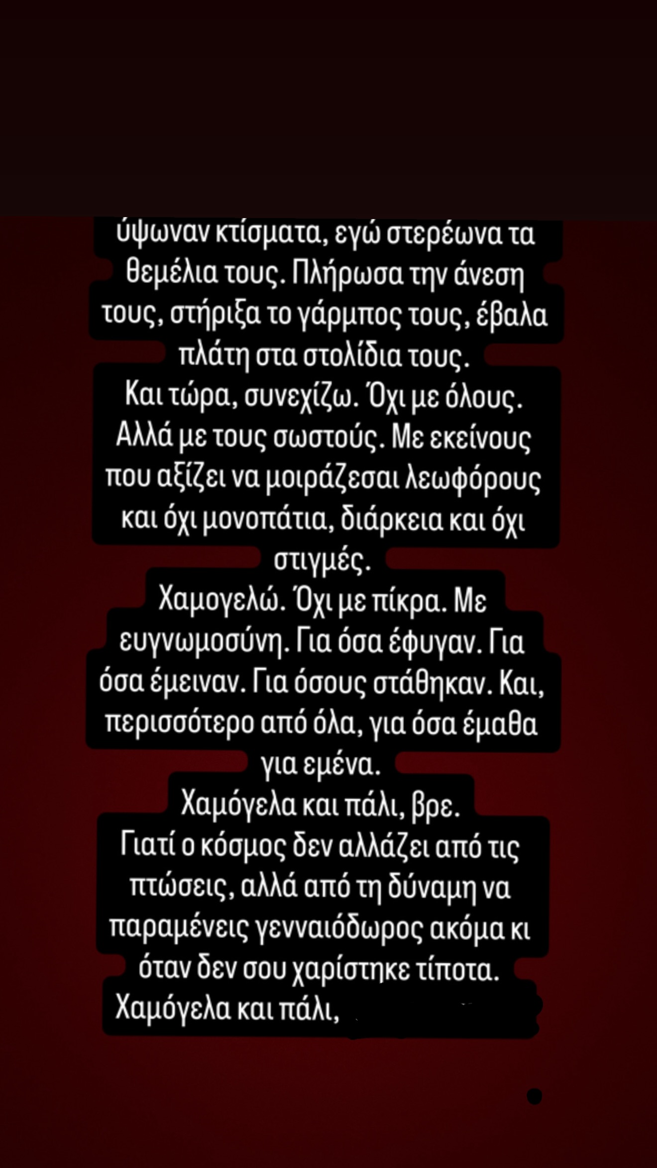 Μέσα από μια μακροσκελή ανάρτηση στον προσωπικό του λογαριασμό στο Instagram, η οποία ήρθε μετά το επαγγελματικό «διαζύγιο» με την Κατερίνα Καινούργιου, το οποίο επηρέασε και τις προσωπικές τους σχέσεις, αναφέρει: