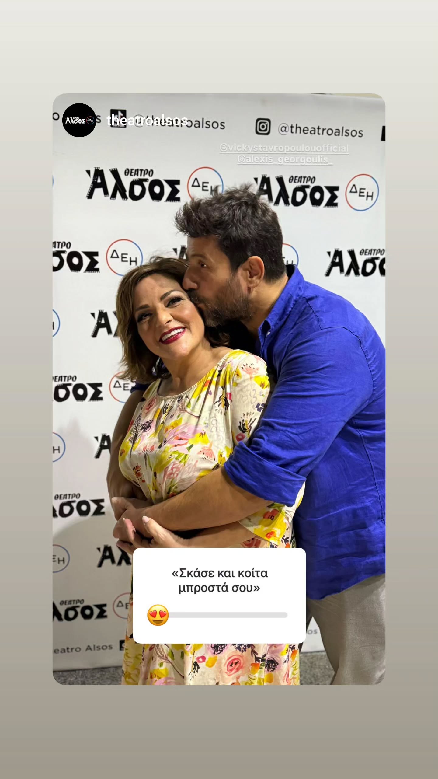 Όλα ξεκίνησαν όταν ο Αλέξης Γεωργούλης, ως θεατής, βρέθηκε στην παράσταση στην οποία πρωταγωνιστεί η Βίκυ Σταυροπούλου. Κατά τη διάρκεια του έργου, σε μια αυθόρμητη και απρόσμενη κίνηση, η ηθοποιός κατέβηκε από τη σκηνή και πλησίασε τον καλό της φίλο. Αφού τον αγκάλιασε θερμά, τον φίλησε στο στόμα, προκαλώντας τον ενθουσιασμό και τα χειροκροτήματα του κοινού!