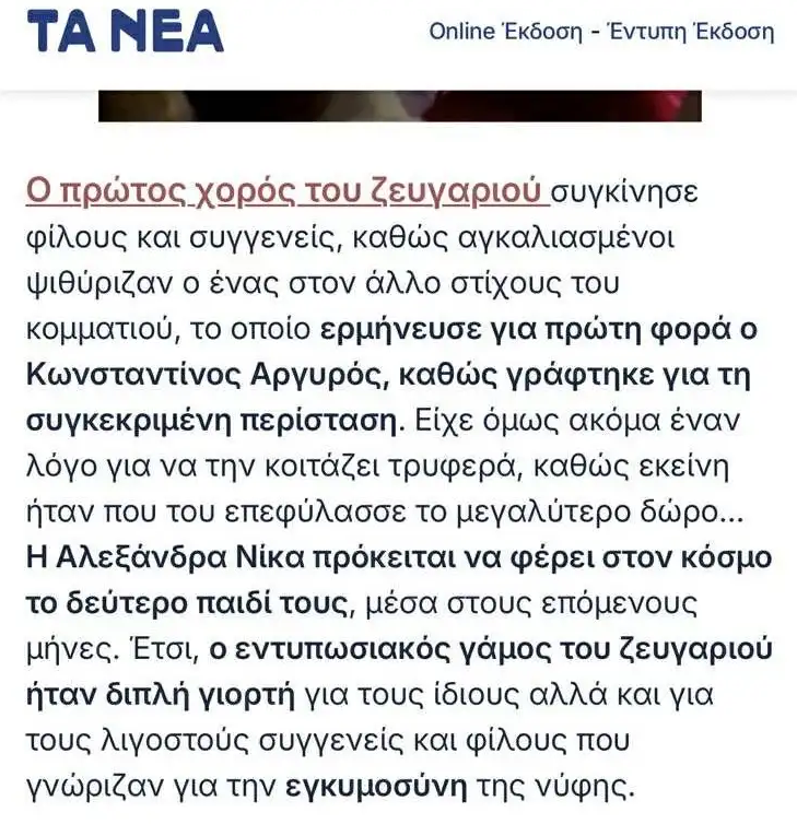 Σύμφωνα με δημοσίευμα του nea.gr, η Αλεξάνδρα Νίκα είναι και πάλι έγκυος! Ο Κωνσταντίνος Αργυρός και η συζυγός του, είναι μαζί εδώ και σχεδόν τρία χρόνια και έχει ήδη έναν γιο, τον 8 μηνών Βασίλη (όπως αναμένεται να ονομαστεί), θα υποδεχθεί – σύμφωνα με το δημοσίευμα – σύντομα το δεύτερο παιδί του…