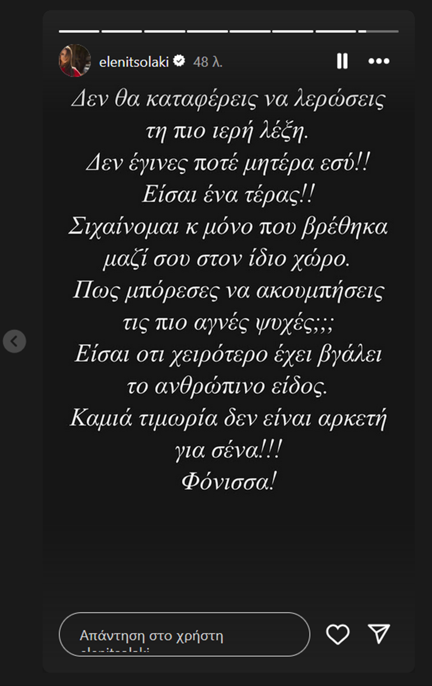 «Δεν θα καταφέρεις να λερώσεις την πιο ιερή λέξη. Δεν έγινες ποτέ μητέρα εσύ! Είσαι ένα τέρας! Σιχαίνομαι και μόνο που βρέθηκα μαζί σου στον ίδιο χώρο. Πώς μπόρεσες να ακουμπήσεις τις πιο αγνές ψυχές; Είσαι ό,τι χειρότερο έχει βγάλει το ανθρώπινο είδος. Καμιά τιμωρία δεν είναι αρκετή για σένα! Φόνισσα!», έγραψε η παρουσιάστρια η οποία είχε φιλοξενήσει την Ειρήνη Μουρτζούκου στην εκπομπή της.