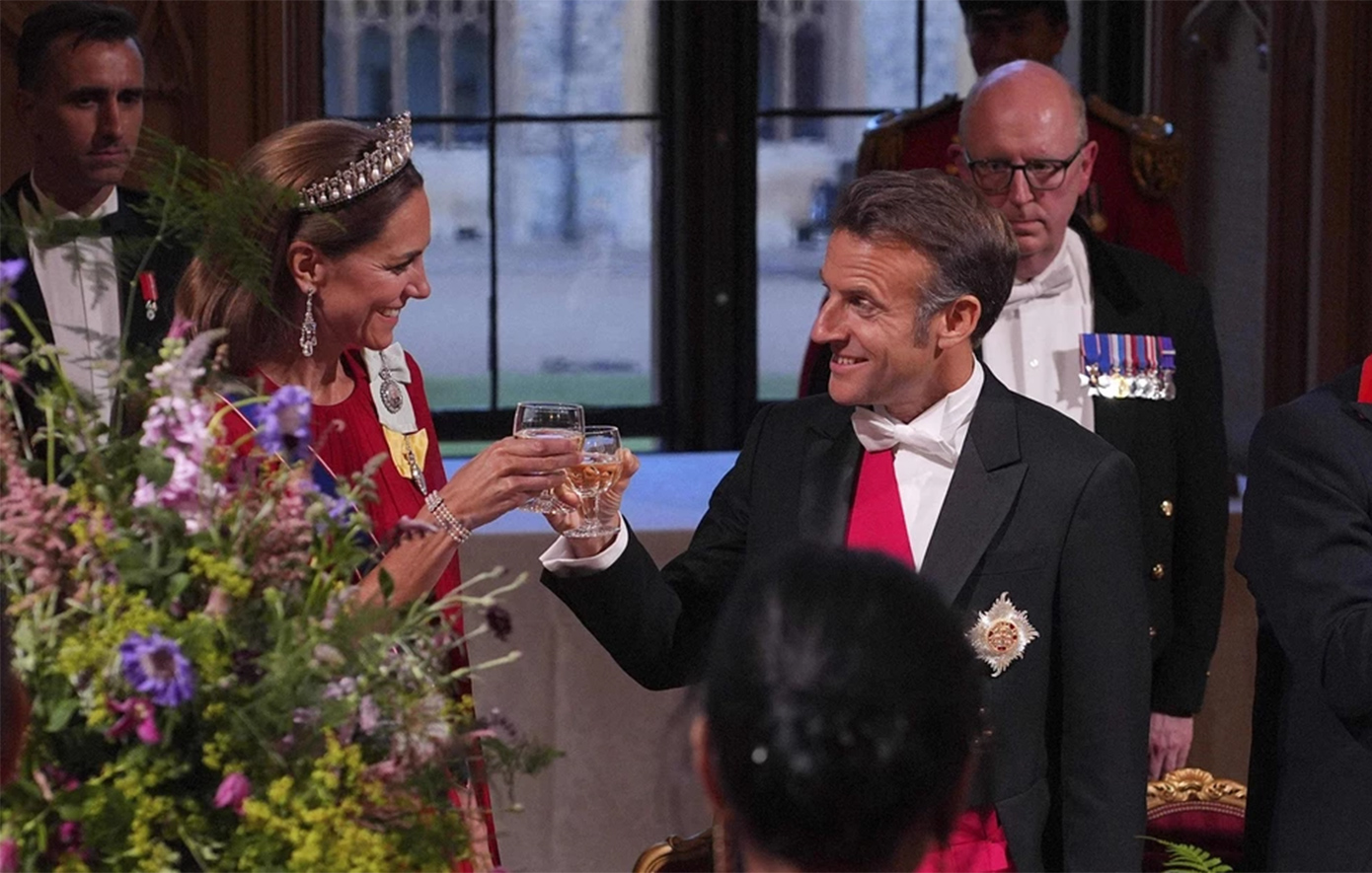 Η «χαλαρή» προσέγγιση του Μακρόν δεν περιορίστηκε εκεί. Λίγο αργότερα, στο λαμπερό κρατικό δείπνο της Τρίτης, που φιλοξενήθηκε στο Κάστρο του Γουίνδσορ (για πρώτη φορά από το 2014, λόγω ανακαινίσεων στο Παλάτι του Μπάκιγχαμ), ο Γάλλος Πρόεδρος απαθανατίστηκε να κλείνει το μάτι στην πριγκίπισσα της Ουαλίας, Κέιτ Μίντλετον. Οι δύο τους εθεάθησαν να τσουγκρίζουν ποτήρια και να συνομιλούν καθ’ όλη τη διάρκεια του δείπνου.