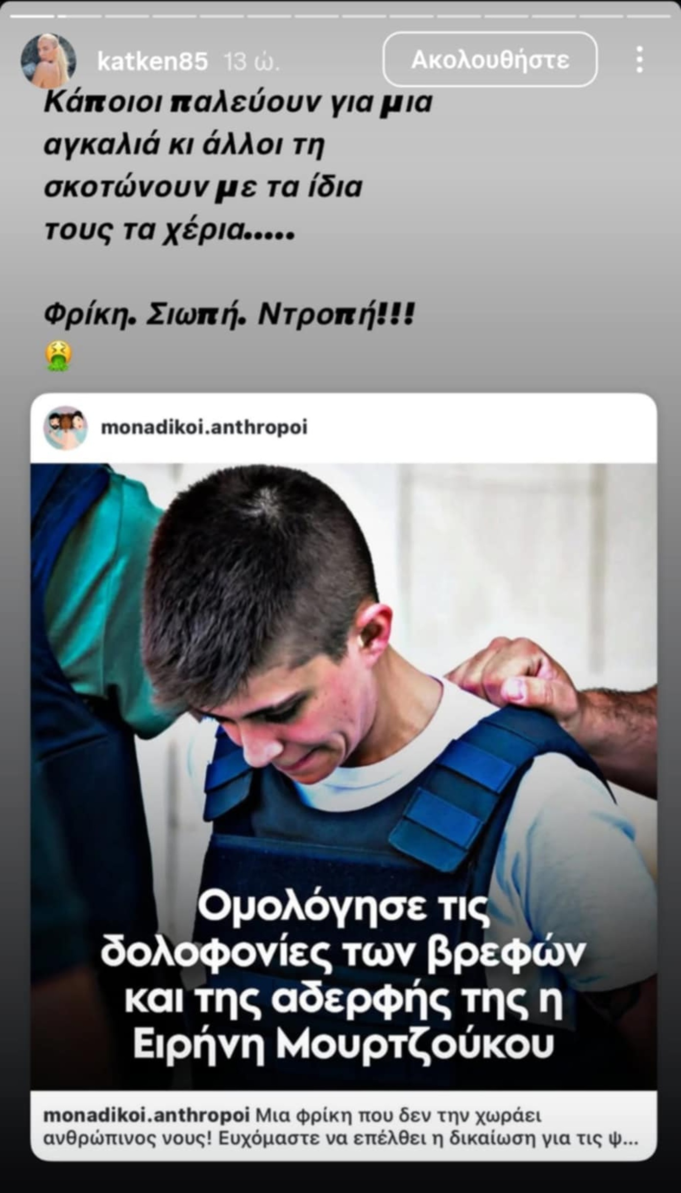 Οι αποκαλύψεις της Ειρήνης Μουρτζούκου στην ανωμοτί κατάθεσή της για τη δολοφονία τεσσάρων βρεφών έχουν προκαλέσει σοκ στο πανελλήνιο. Λίγες ώρες μετά τη δημοσιοποίηση της υπόθεσης, η Κατερίνα Καινούργιου αντέδρασε με έντονο τρόπο μέσω Instagram.