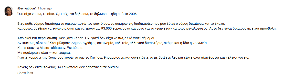 Σε άλλο σημείο γράφει: «Ό,τι είχα να πω, το είπα. Ό,τι είχα να δηλώσω, το δήλωσα, ήδη από το 2006. Είχα κάθε νόμιμο δικαίωμα να υπερασπιστώ τον εαυτό μου, να ασκήσω τις διαδικασίες που μου έδινε ο νόμος δικαίωμα και το έκανα. Και όμως, βρέθηκα να χάνω μια δίκη και να χρωστάω 93.000 ευρώ, μόνο και μόνο για να «φαίνεται» κάποιος μεγαλόψυχος. Αυτό δεν είναι δικαιοσύνη, είναι προσβολή.