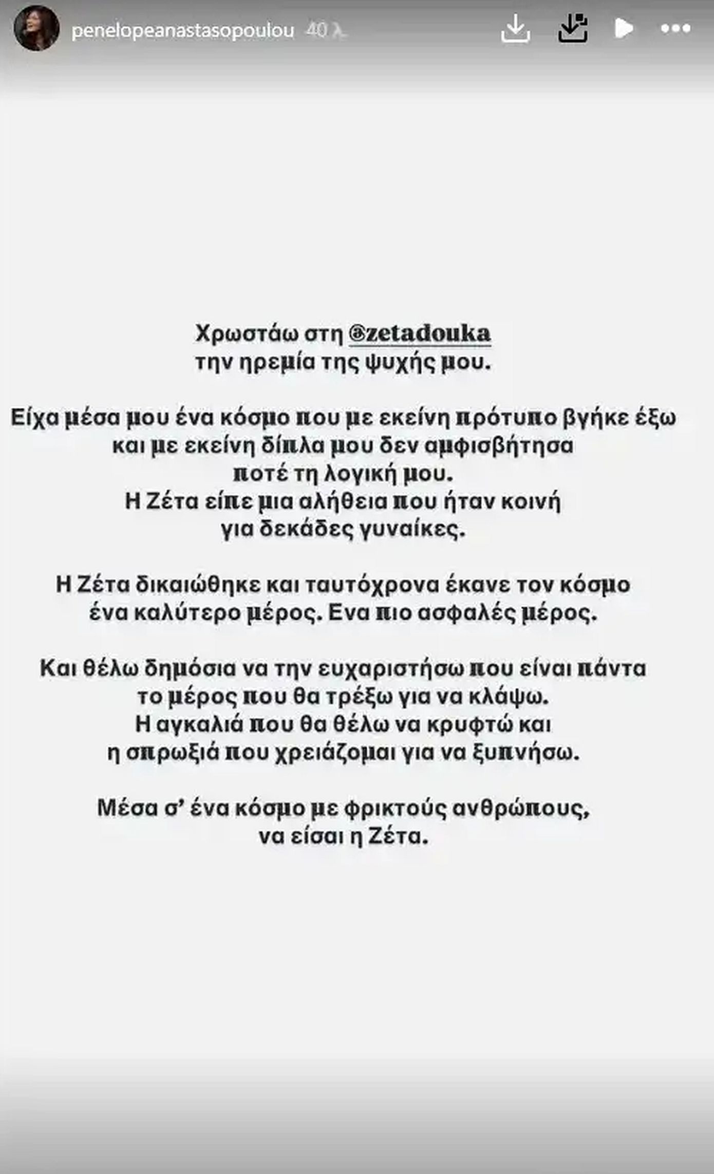 Η Πηνελόπη Αναστασοπούλου, με ανάρτηση που έκανε στον προσωπικό της λογαριασμό στο Instagram, θέλησε να στείλει το δικό της μήνυμα στήριξης και παράλληλα το «ευχαριστώ» της προς τη Ζέτα Δούκα.