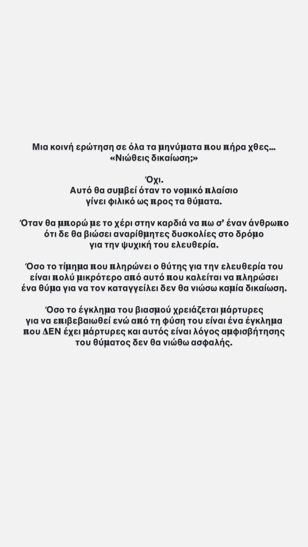 Όσο το τίμημα που πληρώνει ο θύτης για την ελευθερία του είναι πολύ μικρότερο από αυτό που καλείται να πληρώσει ένα θύμα για να τον καταγγείλει δεν θα νιώσω καμία δικαίωση.