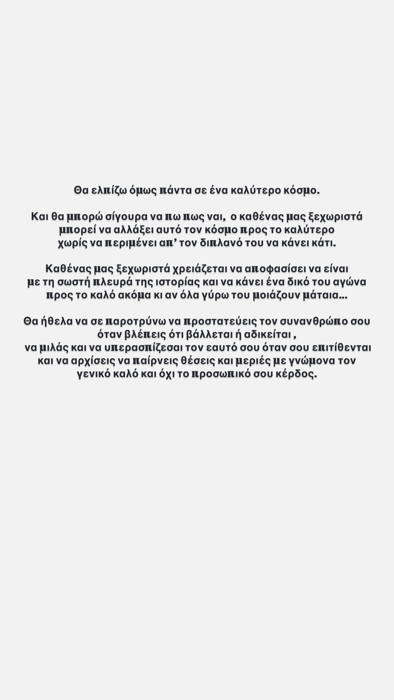 Θα ήθελα να σε παροτρύνω να προστατεύσεις τον συνάνθρωπό σου όταν βλέπεις ότι βάλλεται ή αδικείται, να μιλάς και να υπερασπίζεσαι τον εαυτό σου όταν σου επιτίθενται και να αρχίσεις να παίρνεις θέσεις και μεριές με γνώμονα τον γενικό καλό και όχι το προσωπικό σου κέρδος»