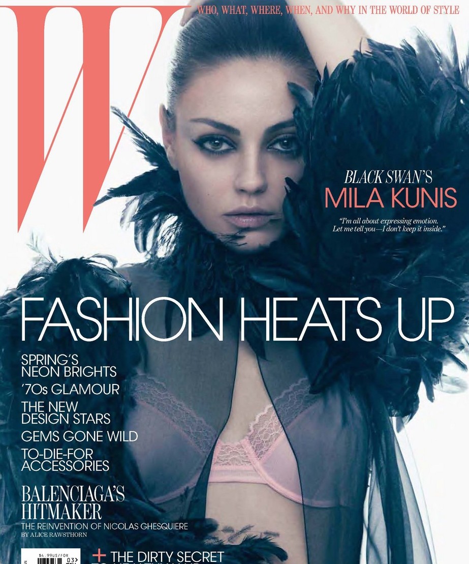 Ο συνδυασμός του σεξαπίλ και του ταλέντου της έχουν κάνει τη Mila Kunis μια από τις πιο πολυσυζητημένες φετινές παρουσίες στη showbiz. Η ηθοποιός του «Black Swan» πόζαρε για το τεύχος Μαρτίου του περιοδικού «W», όπου μίλησε για τη συμμετοχή της στην ταινία της χρονιάς.