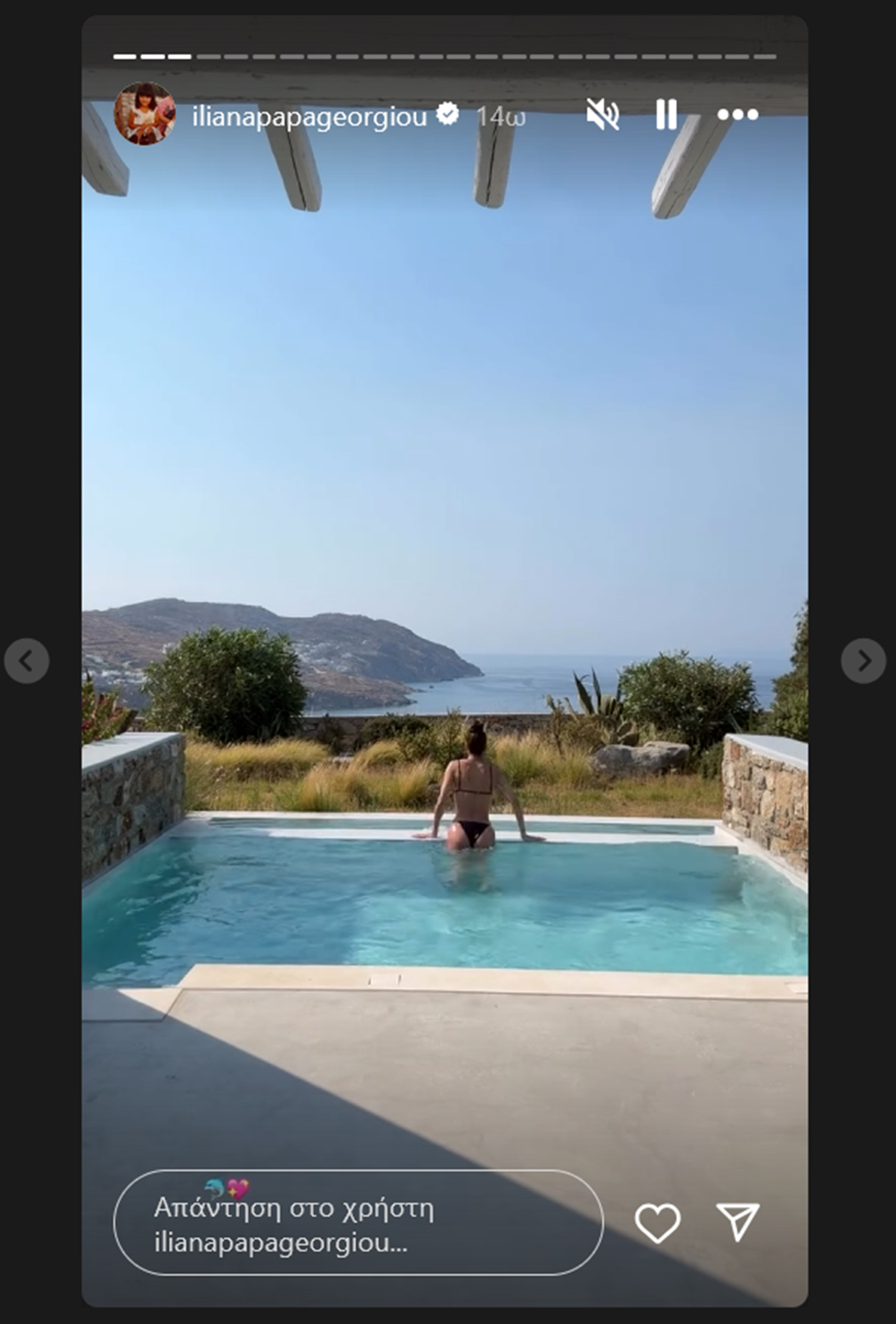 Η σχέση της με το νησί είναι στενή, αφού εκεί διαμένει μόνιμα η αδελφή της με την οικογένειά της. Την Πέμπτη 17 Ιουλίου, η Ηλιάνα δημοσίευσε φωτογραφίες με μαγιό από τη Μύκονο, αποκαλύπτοντας στους followers της το ειδυλλιακό σημείο όπου έκανε το μπάνιο της: «μια μικρή πισίνα με θέα τη θάλασσα του νησιού».