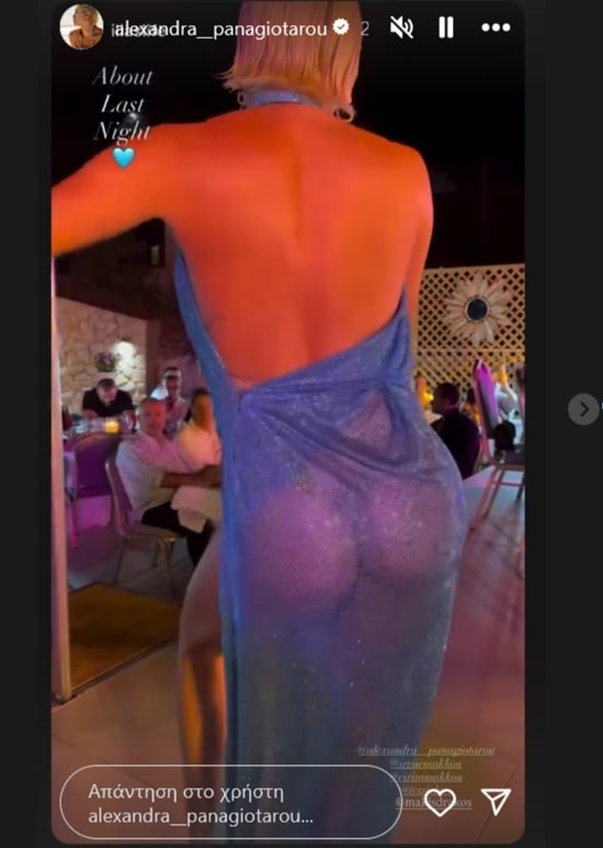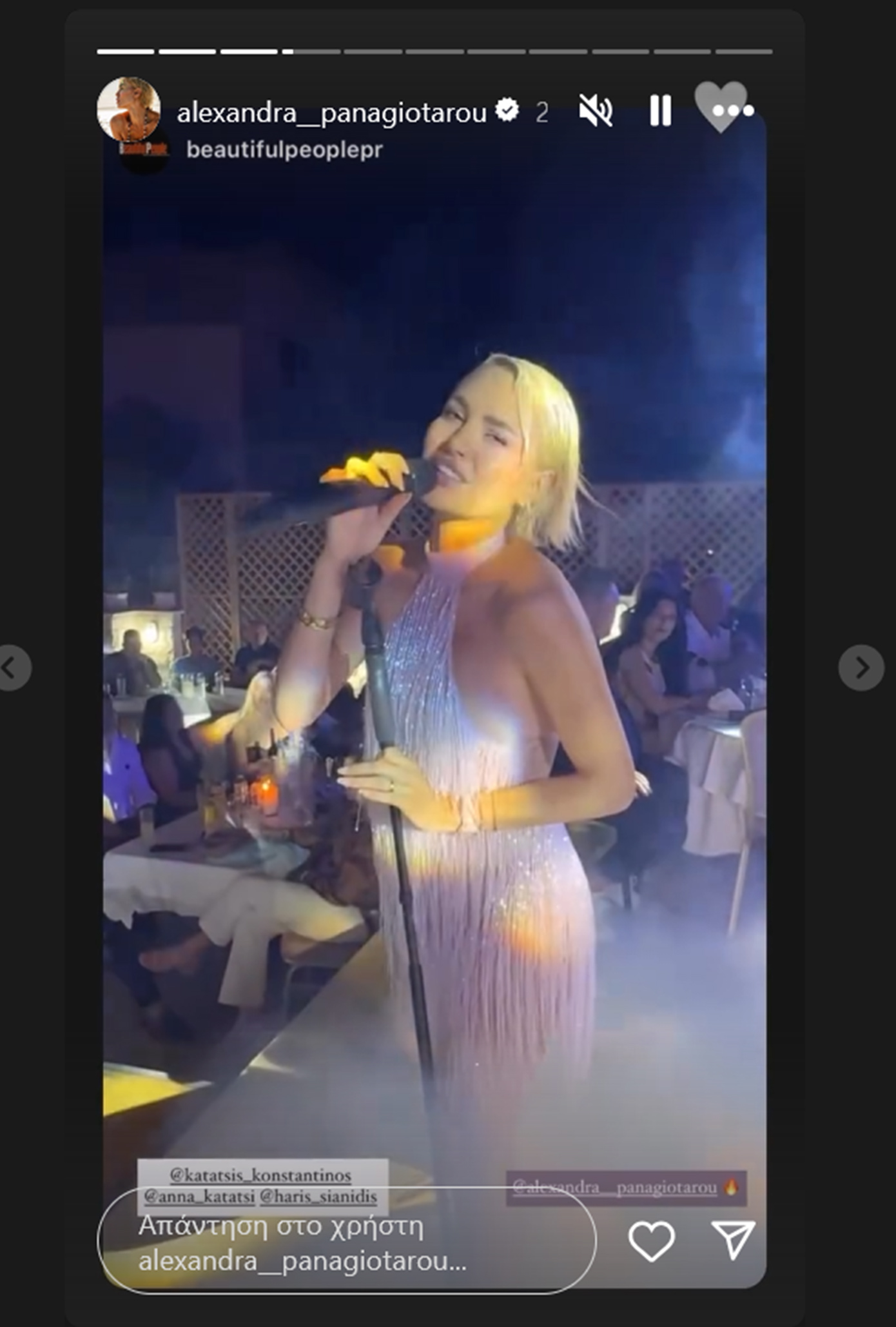 Με ένα διάφανο γαλάζιο φόρεμα γεμάτο glitter εμφανίστηκε η Αλεξάνδρα Παναγιώταρου σε υπαίθριο χώρο, τραγουδώντας μπροστά σε κοινό και συγκεντρώνοντας όλα τα βλέμματα πάνω της. Η εντυπωσιακή εμφάνισή της ξεχώρισε για την αισθησιακή, αλλά κομψή αισθητική της.