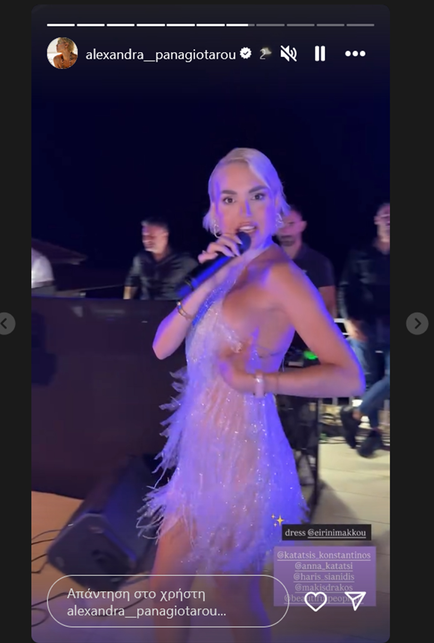 Λίγο αργότερα, η ίδια φόρεσε ακόμη ένα αστραφτερό φόρεμα της γνωστής σχεδιάστριας Ειρήνης Μάκκου, συνεχίζοντας το performance με εξίσου εντυπωσιακό στιλ.