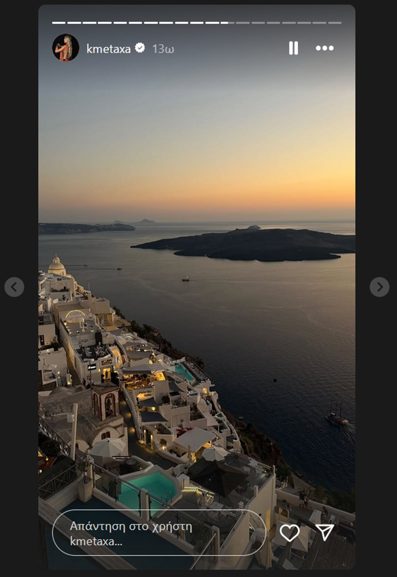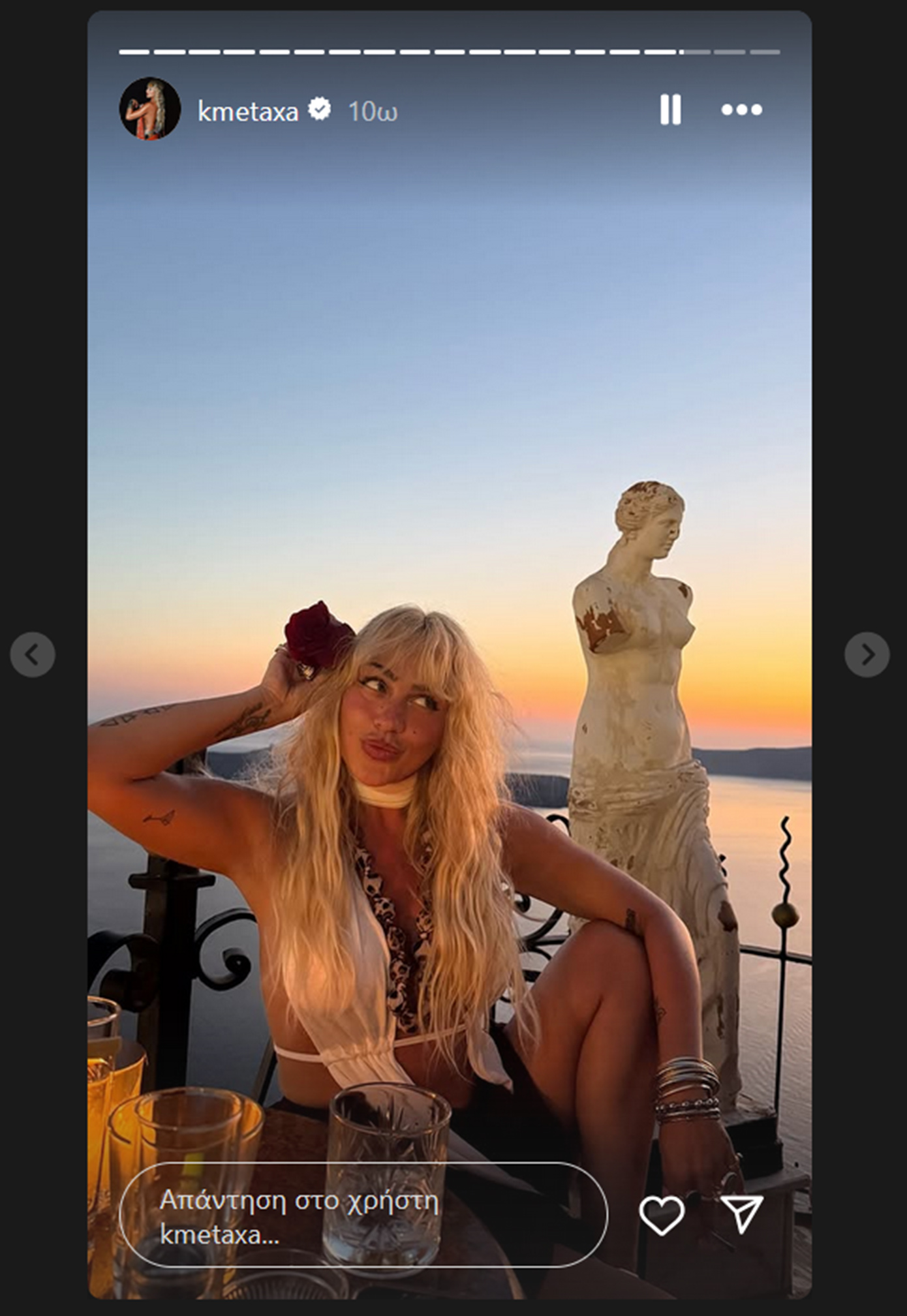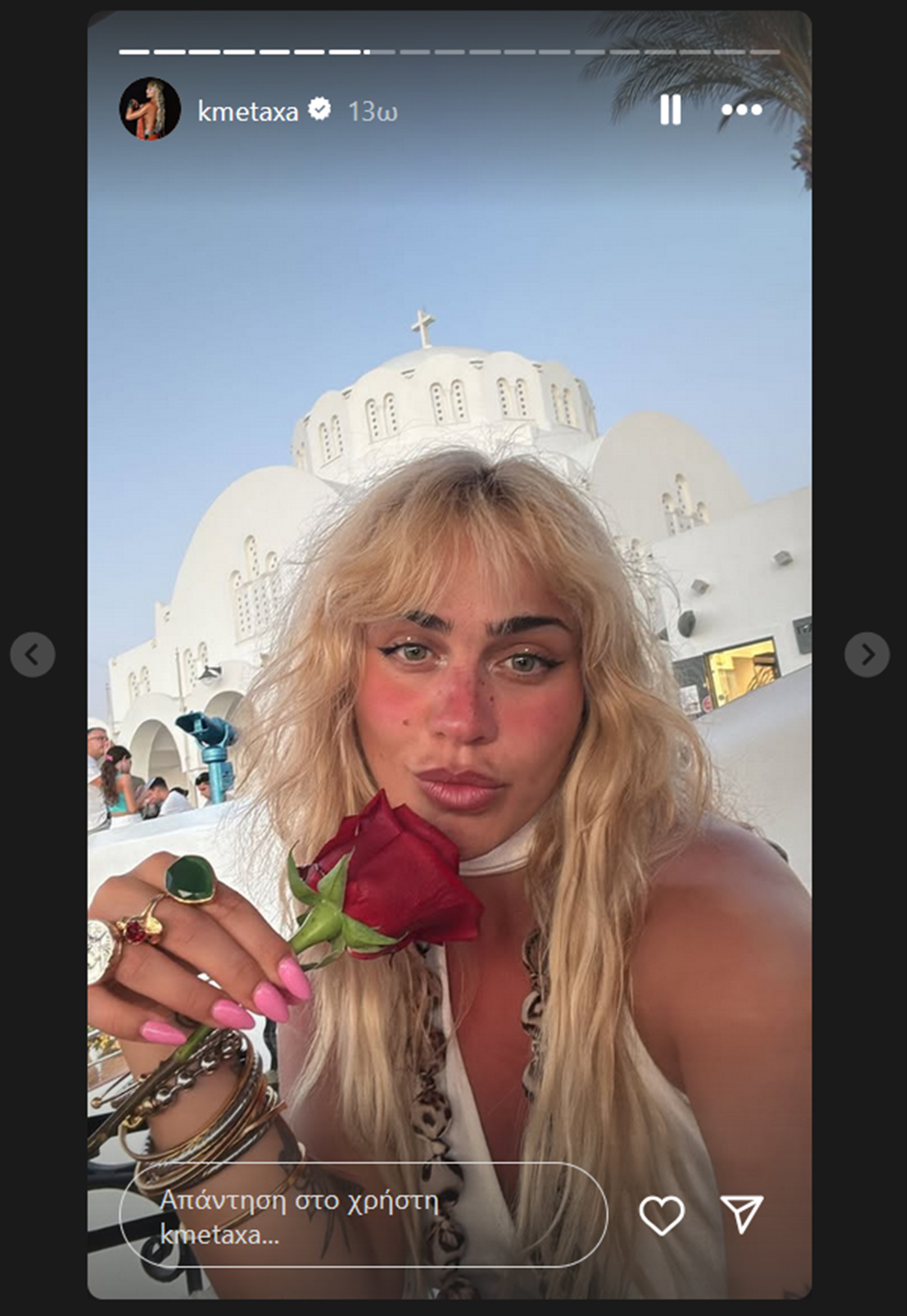 Μέσα από τις φωτογραφίες που ανάρτησε, η Κόνι Μεταξά αποκάλυψε σημεία της Σαντορίνης που την εντυπωσίασαν, ενώ σε ορισμένα στιγμιότυπα ποζάρει χαμογελαστή, κρατώντας ένα κόκκινο τριαντάφυλλο, απολαμβάνοντας τη ρομαντική ατμόσφαιρα του νησιού.