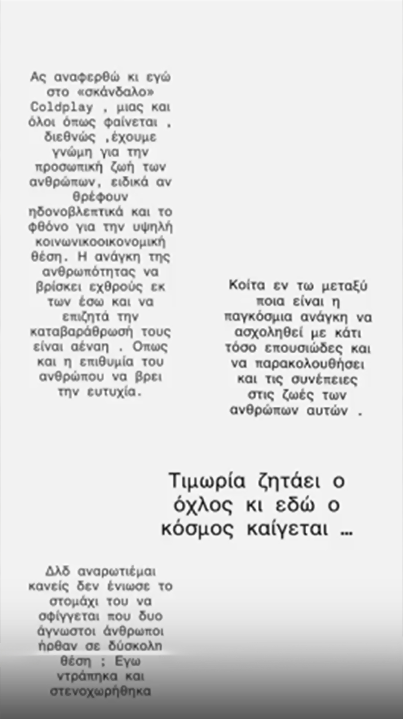 «Ας αναφερθώ κι εγώ στο “σκάνδαλο” Coldplay, μιας και όλοι, όπως φαίνεται, έχουμε γνώμη για την προσωπική ζωή των ανθρώπων, ειδικά αν τρέφουν ηδονοβλεπτικά το φθόνο για την υψηλή κοινωνικοοικονομική θέση.