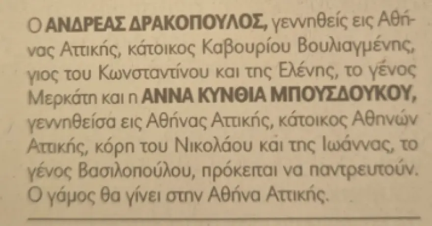 Η είδηση του γάμου του ζευγαριού έγινε γνωστή από την αγγελία του ευτυχούς γεγονότος σε εφημερίδα.