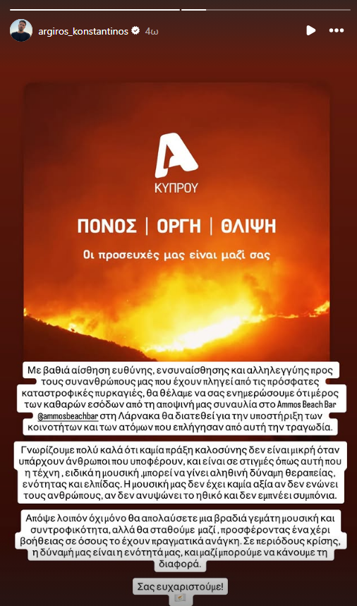 «Με βαθιά αίσθηση ευθύνης, ενσυναίσθησης και αλληλεγγύης προς τους συνανθρώπους μας που έχουν πληγεί από τις πρόσφατες καταστροφικές πυρκαγιές, θα θέλαμε να σας ενημερώσουμε ότι μέρος των καθαρών εσόδων από την αποψινή μας συναυλία στο Ammos beach bar στη Λάρνακα θα διατεθεί για την υποστήριξη των κοινοτήτων και των ατόμων που επλήγησαν από αυτή την τραγωδία.