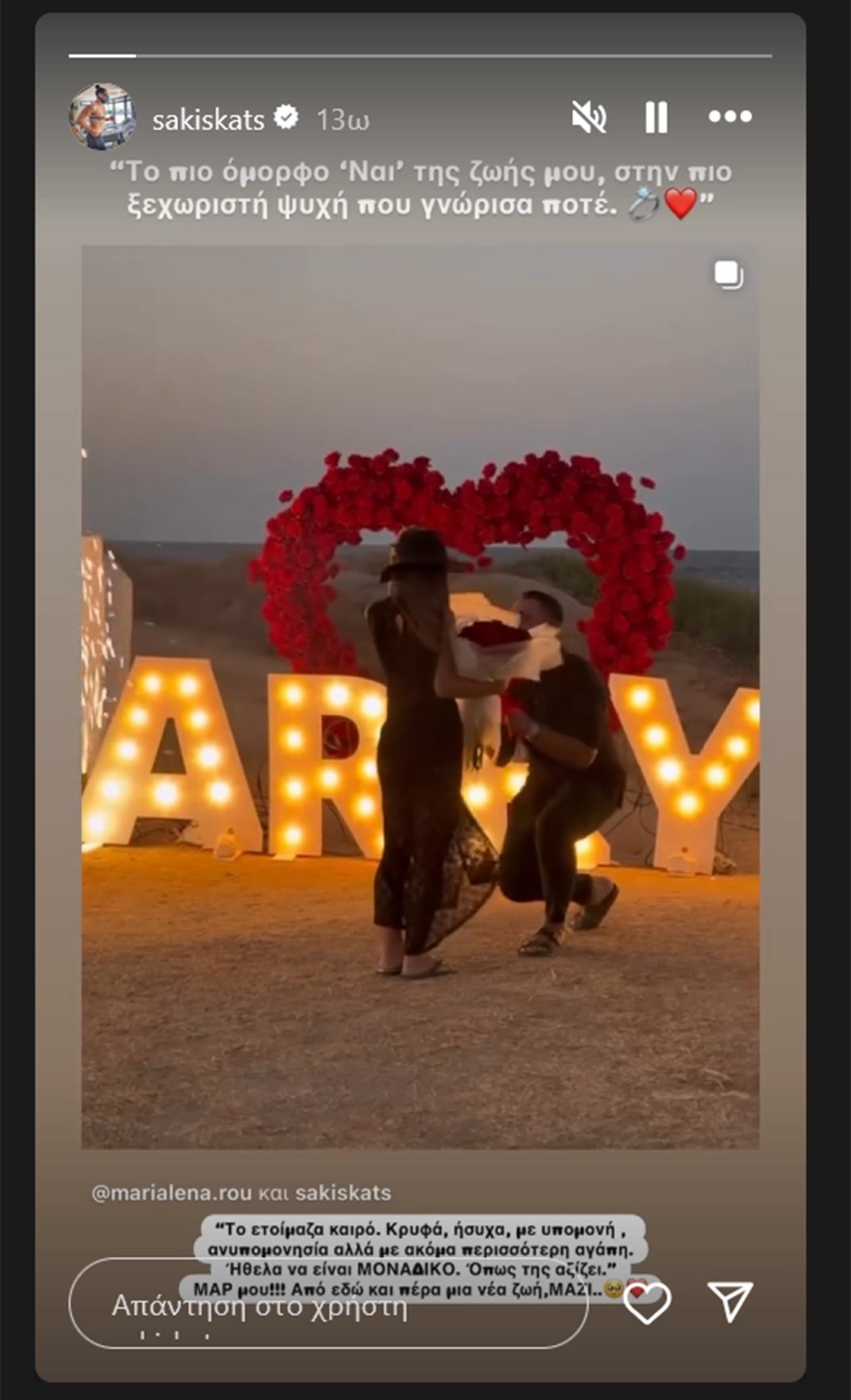 Σε μήνυμα που έγραψε ο Σάκης Κατσούλης στο Instagram, ανέφερε πως το «ναι» της Μαριαλένας Ρουμελιώτη ήταν το πιο όμορφο της ζωής του, ενώ αποκάλυψε πως ήταν κάτι που ετοίμαζε κρυφά και ήσυχα εδώ και καιρό, θέλοντας να είναι μία μοναδική στιγμή.