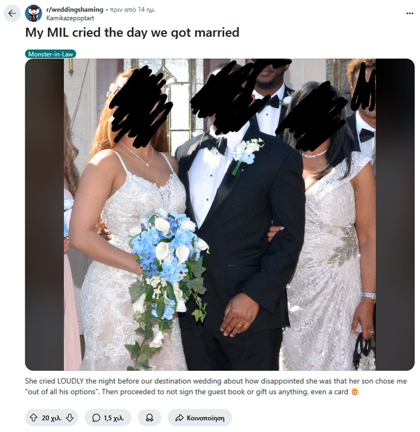 «Το προηγούμενο βράδυ του γάμου μας, που γινόταν σε άλλη πόλη, έκλαιγε δυνατά λέγοντας πόσο απογοητευμένη είναι που ο γιος της με διάλεξε ανάμεσα σε όλες του τις επιλογές», έγραψε η νύφη. «Στη συνέχεια δεν υπέγραψε στο βιβλίο ευχών, ούτε μας χάρισε κάτι, ούτε καν μια κάρτα».