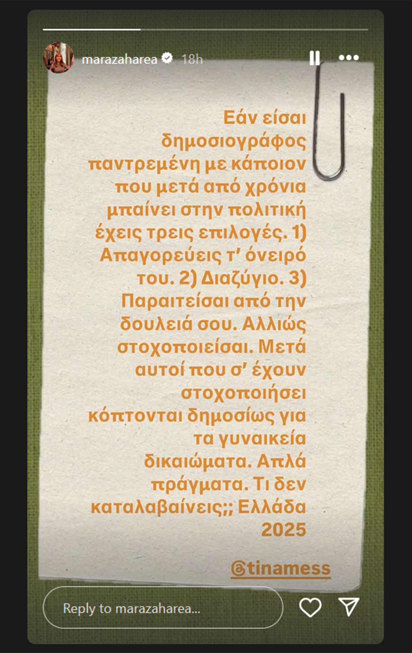 Μέσα από το προφίλ της στο Instagram η Μάρα Ζαχαρέα αναφέρεται στη στοχοποίηση που γίνεται σε συζύγους πολιτικών προσώπων. «Εάν είσαι δημοσιογράφος παντρεμένη με κάποιον που μετά από χρόνια μπαίνει στην πολιτική, έχεις τρεις επιλογές: 1)Απαγορεύεις τ’ όνειρό του. 2) Διαζύγιο. 3)Παραιτείσαι από τη δουλειά σου. Αλλιώς στοχοποιείσαι. Μετά αυτοί που σ’ έχουν στοχοποιήσει κόπτονται για τα γυναικεία δικαιώματα. Απλά πράγματα. Τι δεν καταλαβαίνεις; Ελλάδα 2025», έγραψε η Μάρα Ζαχαρέα στην ανάρτησή της.