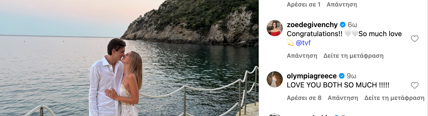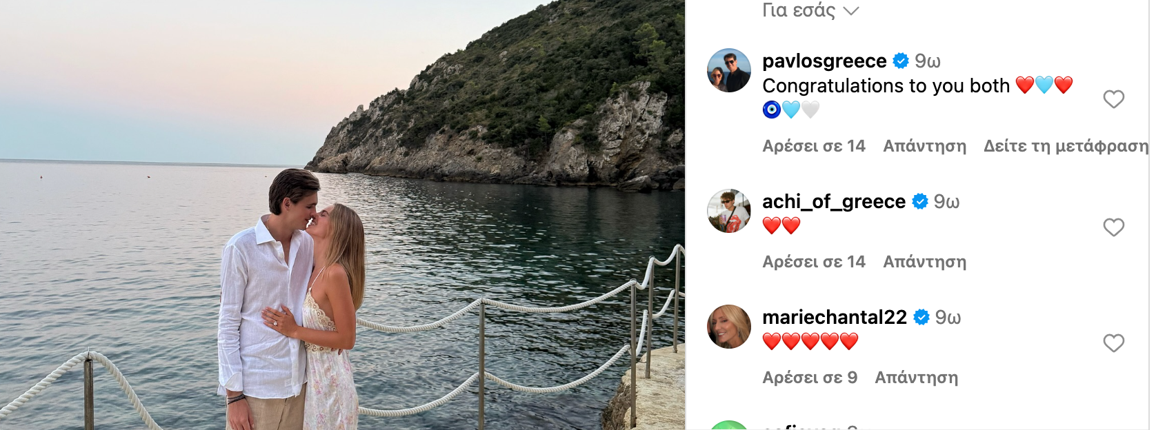 Ανάμεσα στα σχόλια, ξεχώρισαν αυτά της οικογένειας, με τη Μαρί Σαντάλ να στέλνει μία σειρά από κόκκινες καρδιές και τον σύζυγό της, Παύλο, να γράφει «συγχαρητήρια και στους δύο», συνοδεύοντας τις ευχές του με καρδιές και ένα ματάκι για την κακή ενέργεια. Ευχές έστειλε και η κόρη τους, Ολυμπία, γράφοντας «σας αγαπώ και τους δύο τόσο πολύ».