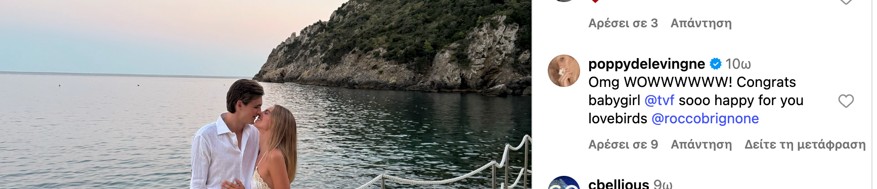 Στις ευχές προστέθηκε και ο πρίγκιπας Αχιλλέας της Ελλάδας, καθώς και η διάσημη Poppy Delevingne, η οποία έγραψε: «Omg WOWWWWWW! Συγχαρητήρια μπέμπα μου @tvf, τόσο χαρούμενη για εσάς τα ερωτευμένα πουλιά».