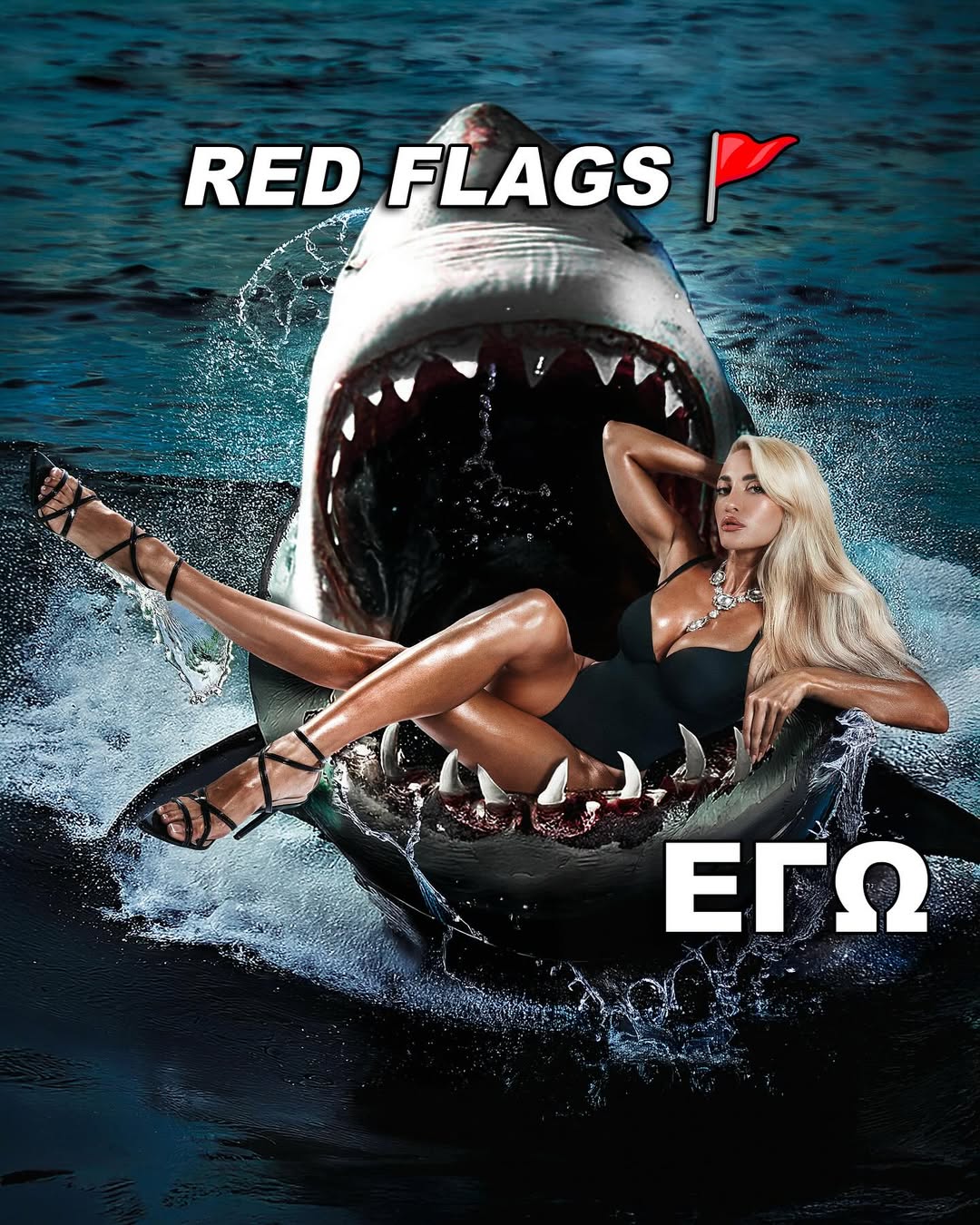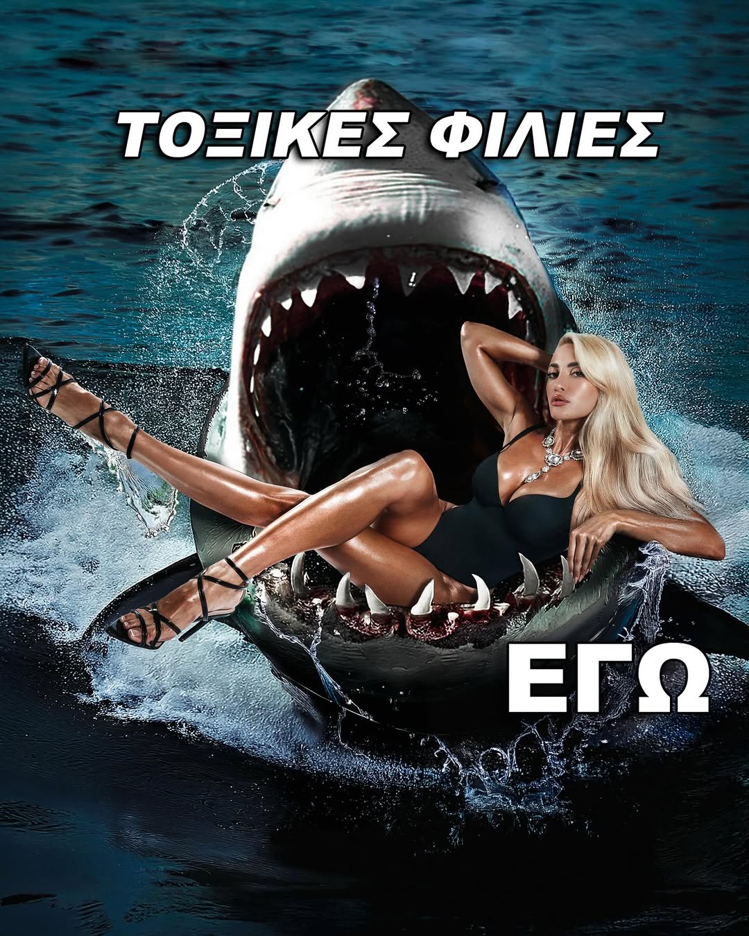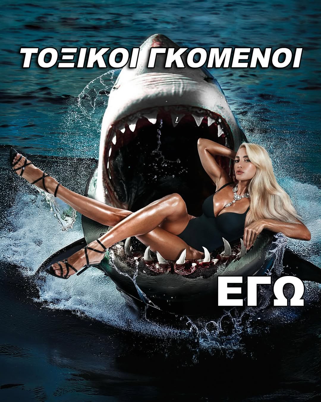 Στην εν λόγω εικόνα, η γνωστή influencer εμφανίζεται να είναι ξαπλωμένη ανάμεσα στα σαγόνια ενός καρχαρία, φορώντας ένα μαύρο φόρεμα.