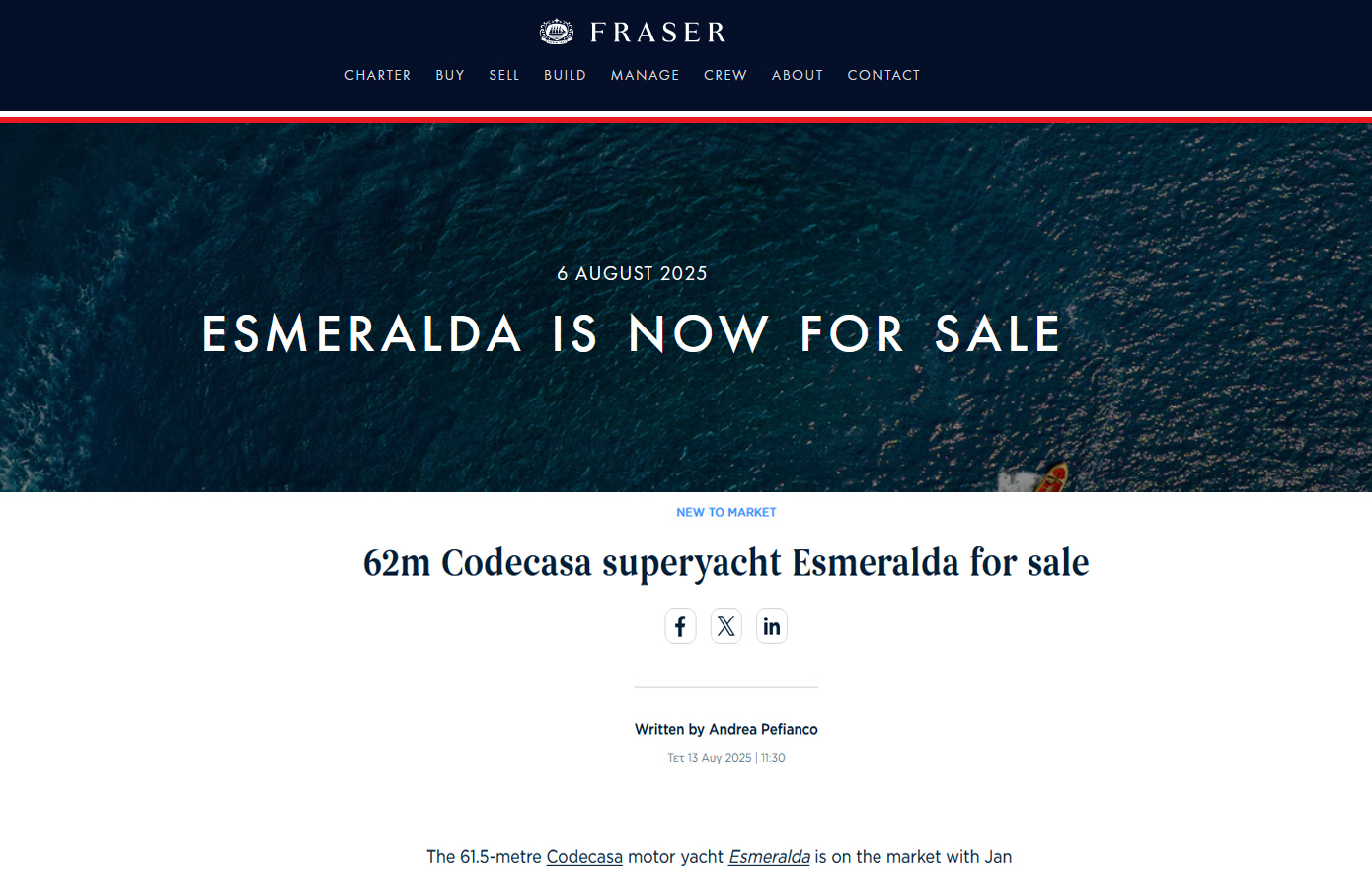 Την ανακοίνωση της πώλησης έκανε αρχικά ο Οίκος «Fraser Yachts» και στην συνέχεια το «Super Yacht Times» καθώς και το έγκυρο «BOAT International».