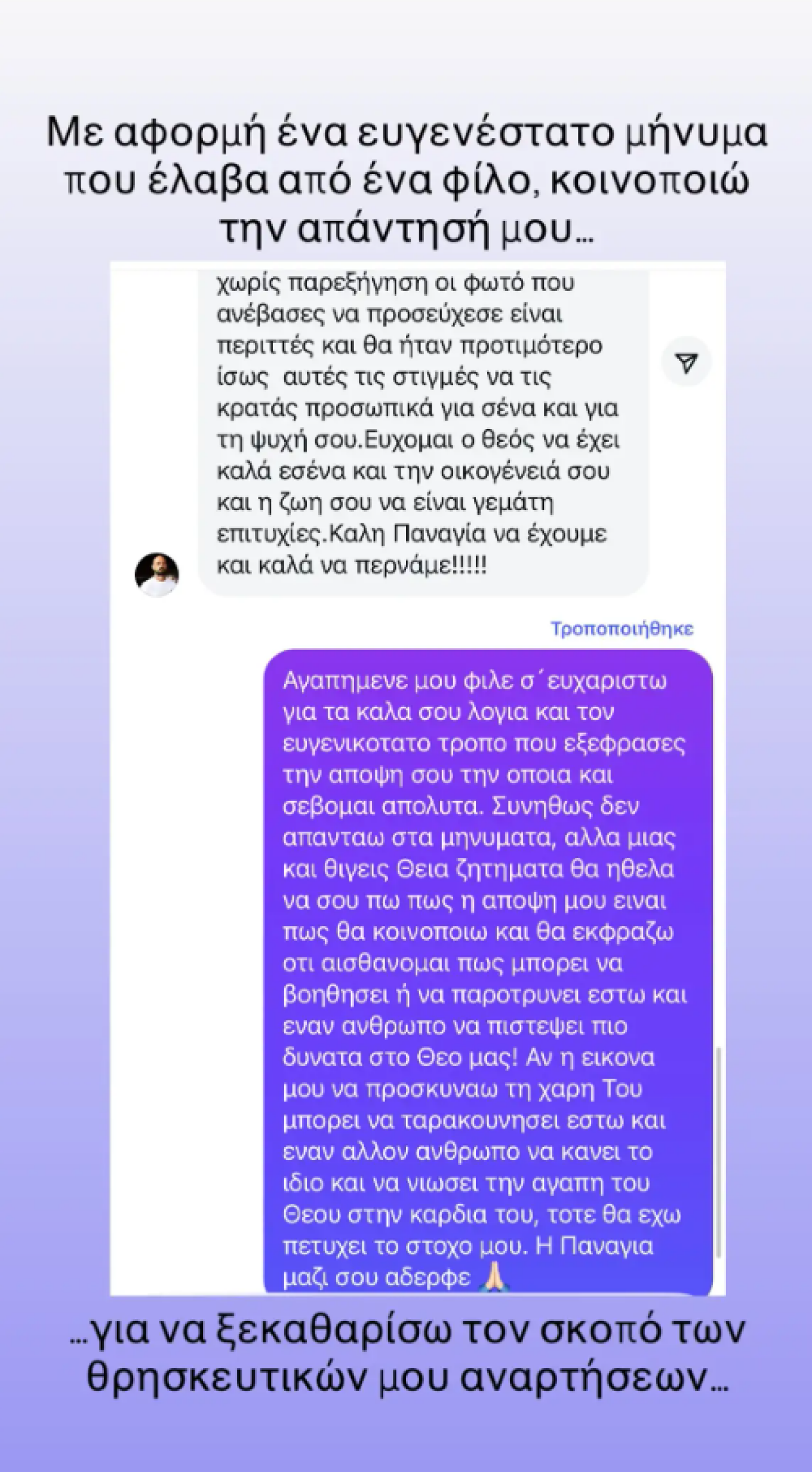 Ο τραγουδιστής απάντησε: «Αγαπημένε μου φίλε σε ευχαριστώ για τα καλά σου λόγια και τον ευγενικότατο τρόπο που εξέφρασες την άποψή σου, την οποία και σέβομαι απόλυτα. Συνήθως δεν απαντάω σε μηνύματα, αλλά μιας και θίγεις Θεία ζητήματα θα ήθελα να σου πω πως η άποψή μου είναι πως θα κοινοποιώ και θα εκφράζω ό,τι αισθάνομαι, ό,τι μπορεί να βοηθήσει ή να παροτρύνει έστω και έναν άνθρωπο να πιστέψει πιο δυνατά στον Θεό μας! Αν η εικόνα μου να προσκυνώ τη χάρη Του μπορεί να ταρακουνήσει έστω και έναν άλλο άνθρωπο να κάνει το ίδιο και να νιώσει την αγάπη του Θεού στην καρδιά του, τότε θα έχω πετύχει τον στόχο μου. Η Παναγιά μαζί σου αδερφέ».