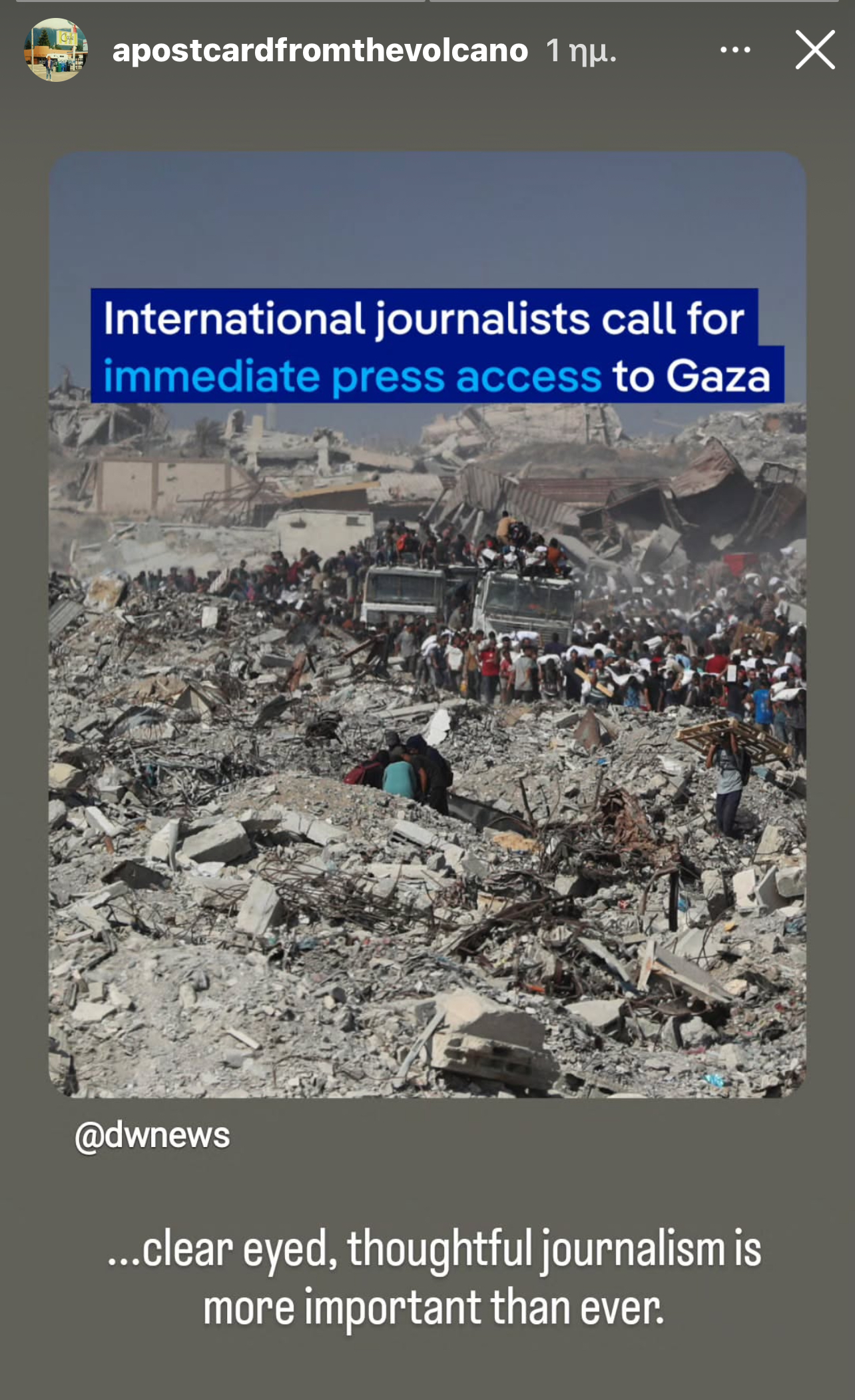 Μέσα από μια ανάρτηση στο προσωπικό του προφίλ σε μέσο κοινωνικής δικτύωσης, ο Νικόλας Νιάρχος μοιράστηκε ένα φωτογραφικό στιγμιότυπο του γερμανικού μέσου DW από την Γάζα, στο οποίο ήταν εμφανής ο όλεθρος. Στο ίδιο μήνυμα, ο δημοσιογράφος υπογράμμισε την έκκληση των διεθνών δημοσιογράφων για άμεση πρόσβαση στην περιοχή.